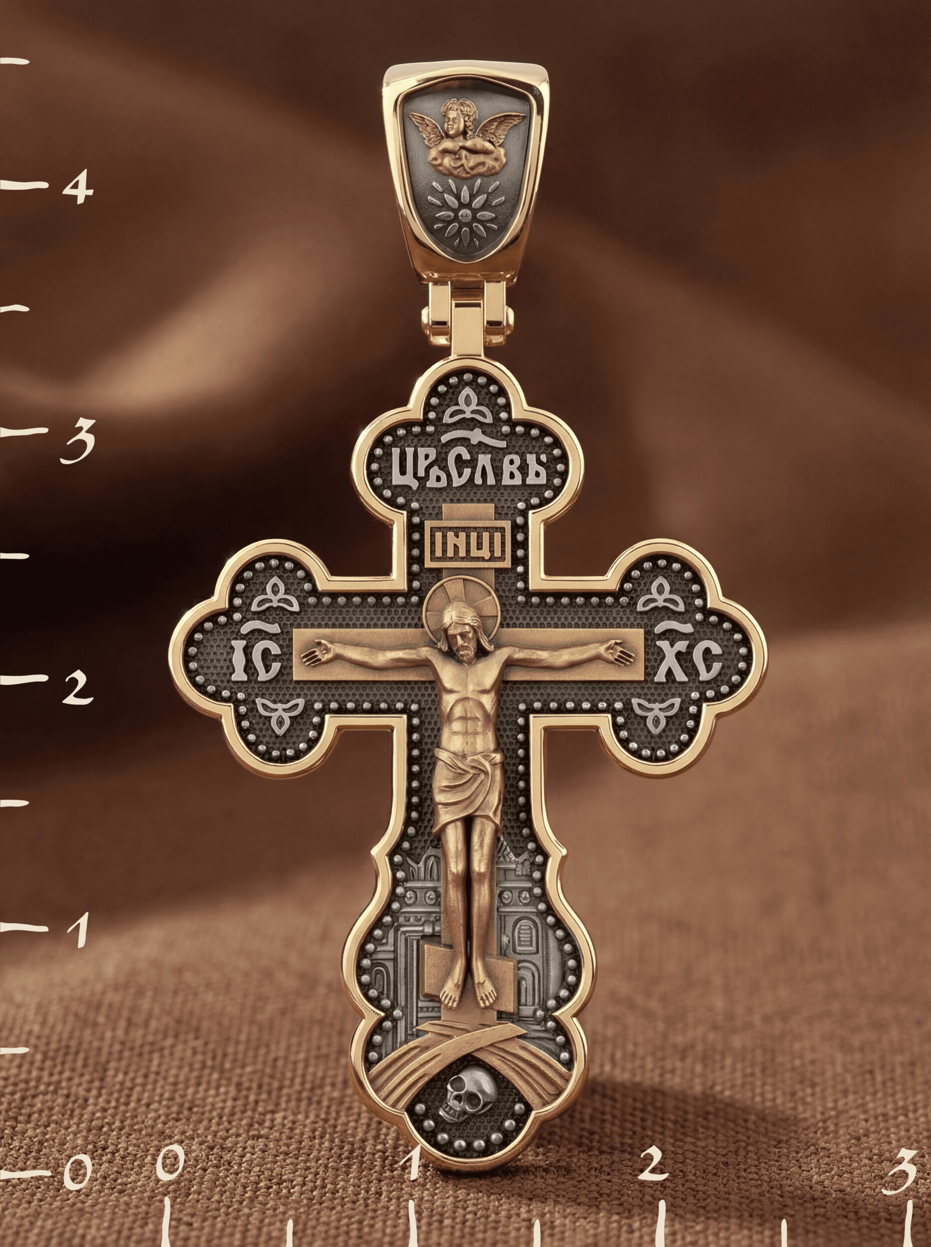На лицевой стороне креста изображено Распятие, потому что это орудие казни Иисус Христос сделал орудием победы над грехом и смертью. Своими страданиями Он искупил грехи человечества, умерев и сошествовав во ад, победил сатану, освободил души праведников от вечной смерти и открыл им небесные врата рая. Жертва Христа сделала возможным спасение для каждого человека. На православном кресте Христос не умирает, а свободно простирает руки, ладони Иисуса открыты, будто он хочет обнять все человечество, даря им свою любовь и открывая путь к вечной жизни. Над титлом видим слова «ЦРЬ СЛВЫ» — Царь Славы. Верхняя перекладина символизирует собой табличку с надписью «IHЦI» — Иисус Назарянин Царь Иудейский. Возле перекладины пишется сокращенно имя Спасителя «IC XC» — Иисус Христос. Возвышение, на котором стоит Крест, символизирует гору Голгофу, на которой произошло Распятие. У подножия Креста изображают прах Адама, обозначенный черепом.