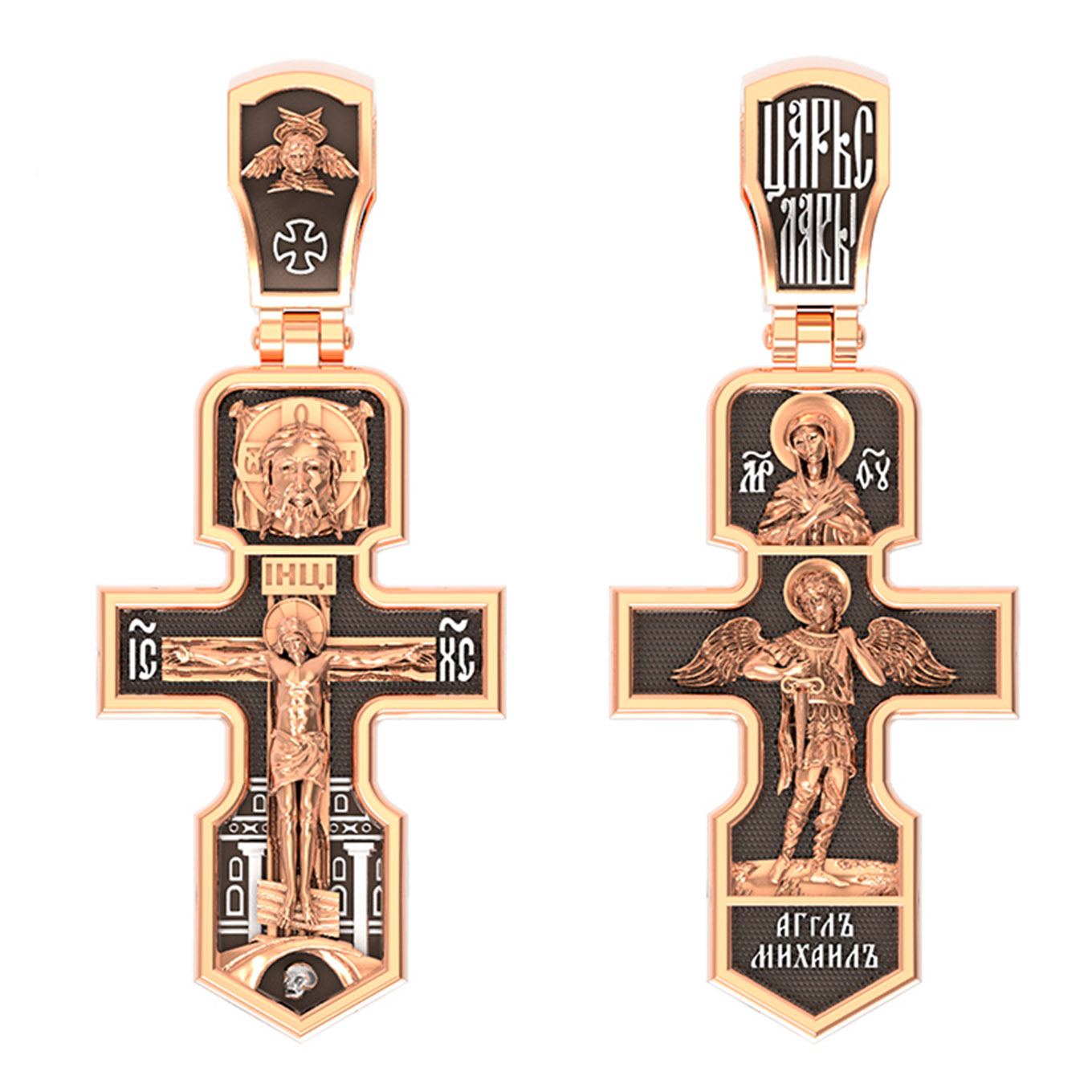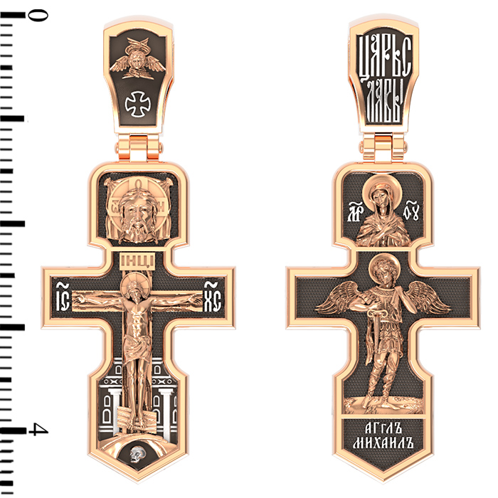 В центре оборота креста изображен Архистратиг Михаил. Могучий Архангел почитается как покровитель воинов и всех верных Богу и ведущих борьбу против сил зла, а также защитник душ умерших, страж райских врат. Над ним изображена икона Божией Матери «Радость всех радостей» или «Серафимово Умиление». Почитание иконы связано с именем преп. Серафима Саровского (1759−1833, канонизирован в 1903 г.). Вся его жизнь проходила под покровительством Богоматери. Богоматерь неоднократно являлась ему в видениях, исцеляла от смертельных болезней. У преп. Серафима было несколько икон Богоматери. Среди них особое место занимала келейная икона, называемая Умиление, которую старец именовал также «Радость всех радостей». Перед нею, стоя на коленях в молитве, он скончался. После смерти преп. Серафима игумен Нифонт передал образ в близлежащий Дивеевский женский монастырь, находившийся под покровительством старца Серафима.