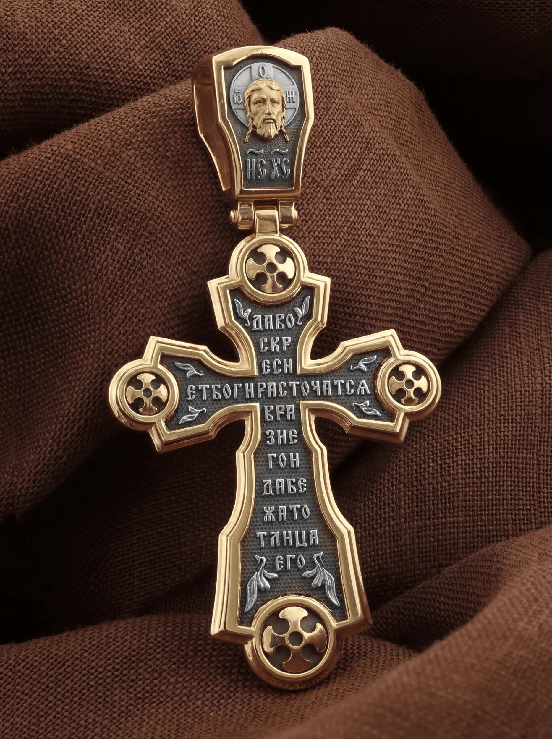 Всю оборотную часть креста занимает начальный стих оградительной молитвы Честному Кресту Господню: «Да воскреснет Бог, и расточатся врази Его, и да бежат от лица Его…».
