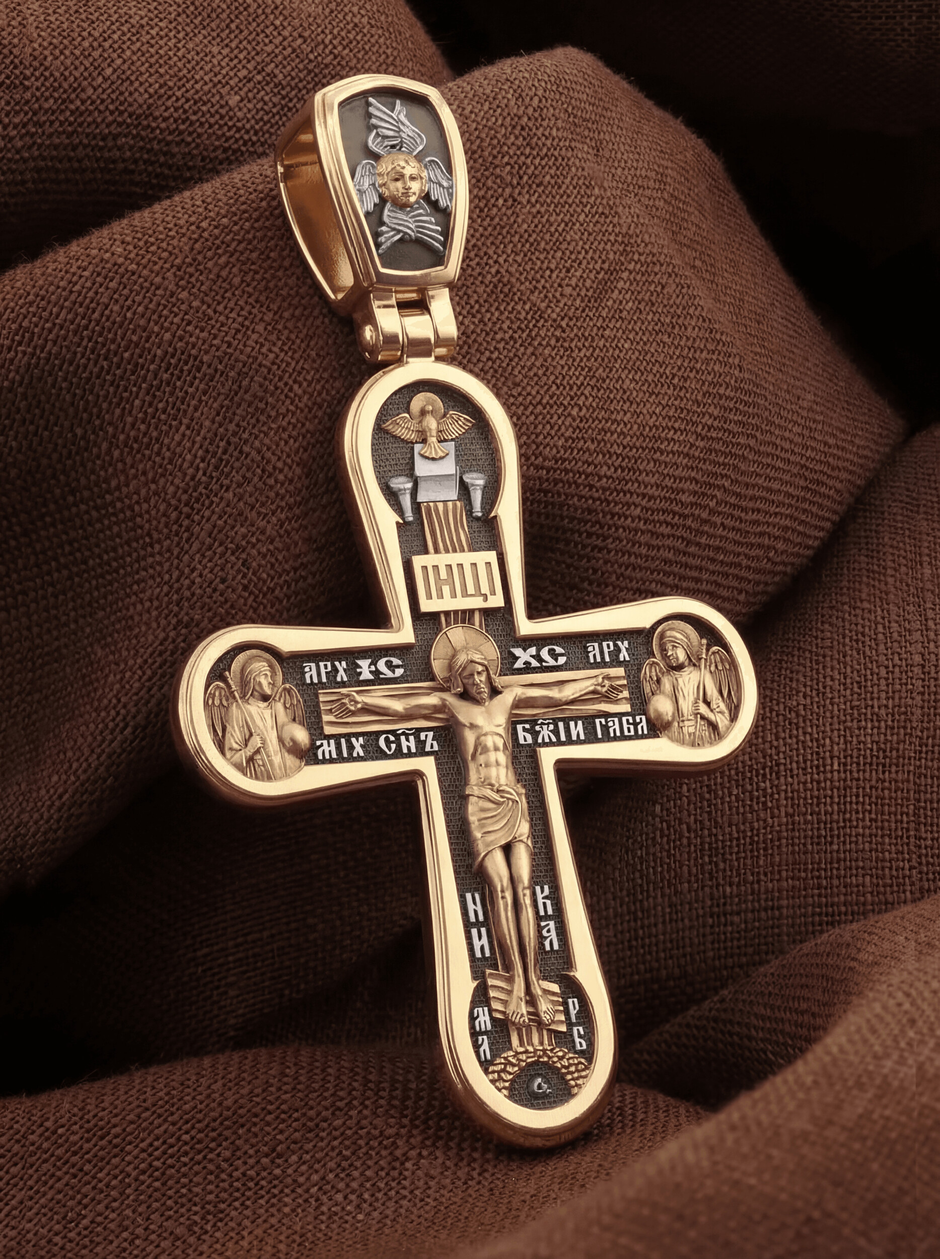 Центральную часть лицевой стороны занимает Распятие Господа Иисуса Христа. Крест стоит на горе камней, символизирующих Голгофу, в основании которой различается череп. Это голова Адама. С обеих стон Его стоят Архангелы: покровитель воинов и всех верных Богу, защитник душ умерших, страж райских ворот — Архистратиг Михаил; и Архангел Гавриил — небесный вестник, покровитель музыкантов и учителей.