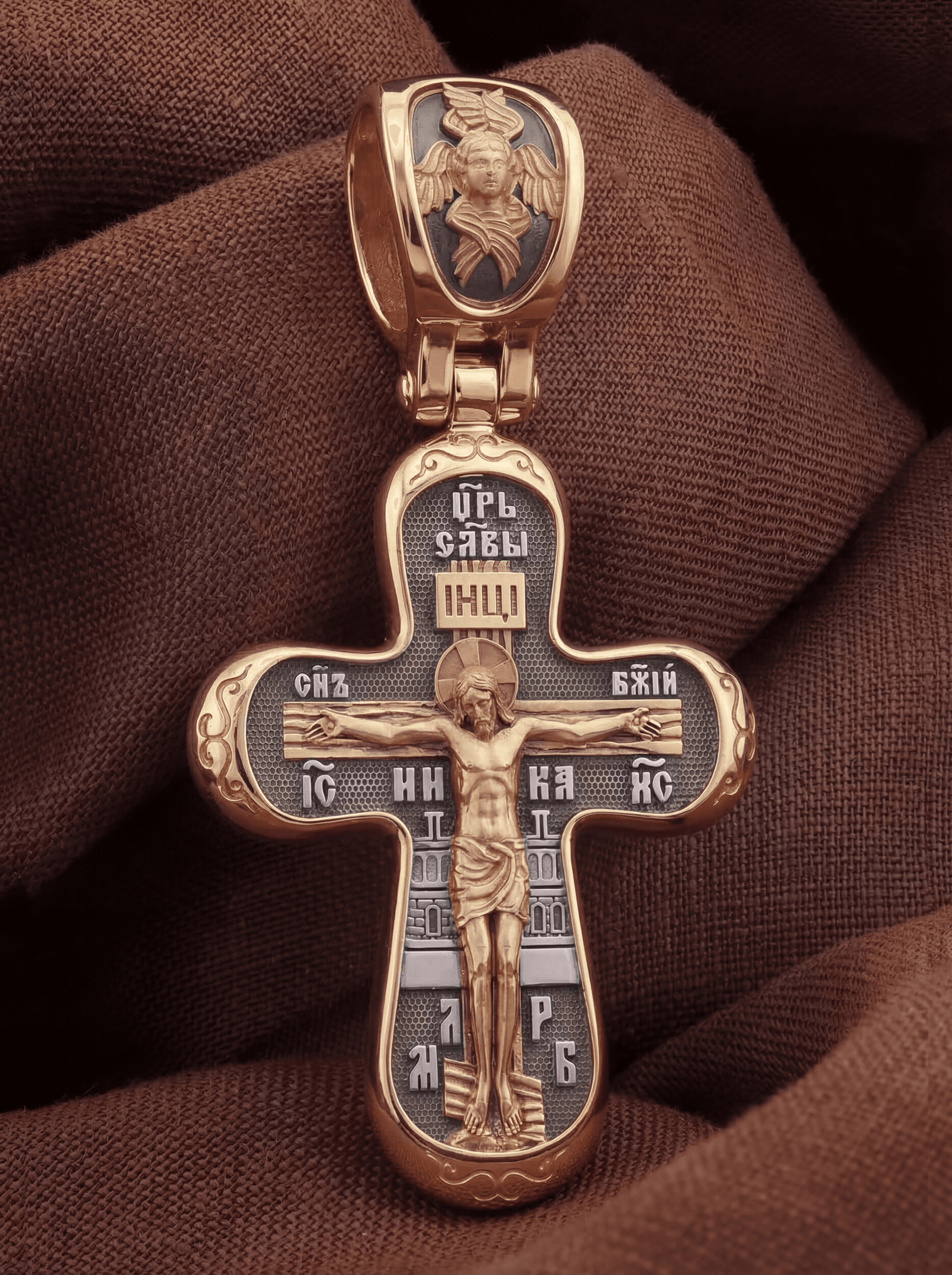 На лицевой стороне креста изображено Распятие Иисуса Христа. Рядом с Его образом помещены слова «Царь Славы». Они характеризуют Господа как Великого Архиерея, победителя смерти. Верхняя перекладина символизирует титло — табличку, на которой, согласно Евангелию, было начертано: Иисус Назорей Царь Иудейский (IНЦI). Также Распятие сопровождается надписями, олицетворяющими Христа. Это святое имя Христа «IC» (Иисус) «ХС» (Христос) и словосочетание «Сын Божий». Рядом с Его образом помещены слова — «НИКА» (греч. — Победитель).У подножия Креста изображают прах Адама, обозначенный черепом. Возвышение, на котором стоит Крест, символизирует гору Голгофу, на которой произошло Распятие. У подножия Креста изображают прах Адама, обозначенный черепом.
