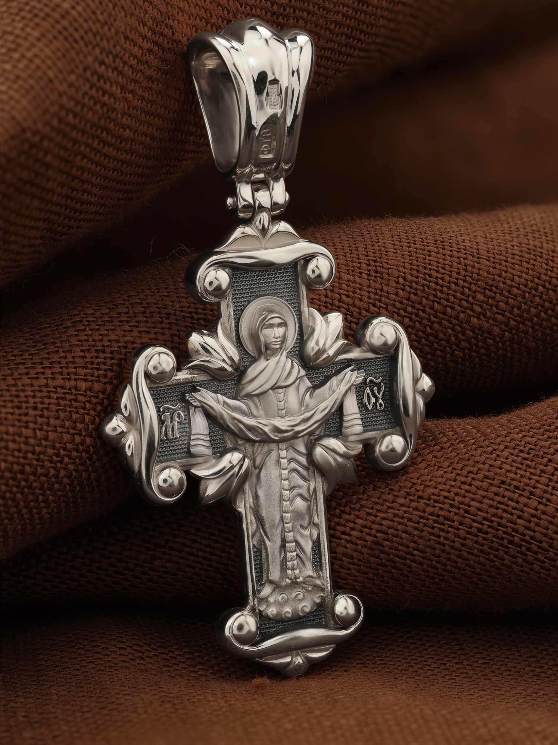 На оборотной стороне креста изображена икона Божией Матери «Покров Пресвятой Богородицы». Праздник Покрова Пресвятой Богородицы пришел на Русь в XII веке из Византии и стал одним из самых почитаемых. В 910 году Византийской Империи угрожали нападением сарацины. Не видя ниоткуда помощи, в те дни греки во множестве стекались в Константинополь, во Влахернский храм, в котором хранились риза Богоматери и Ее головной покров, и молились. 1 (14) октября 910 года Святому Андрею Юродивому и его ученику Епифанию было видение Покрова Божией Матери. Пресвятая Богородица, в окружении Святых, явилась над алтарем Храма и слезно молилась. По окончании молитвы сняла с Себя блистающее великое и страшное покрывало, которое носила на Пречистой главе Своей и, держа его с великой торжественностью, распростерла над всем стоящим народом. Вскоре враги без всякого кровопролития отступили от города. Богородица простирает Свой молитвенный покров над всеми православными христианами и умоляет Сына своего о даровании вечного спасения каждому человеку.