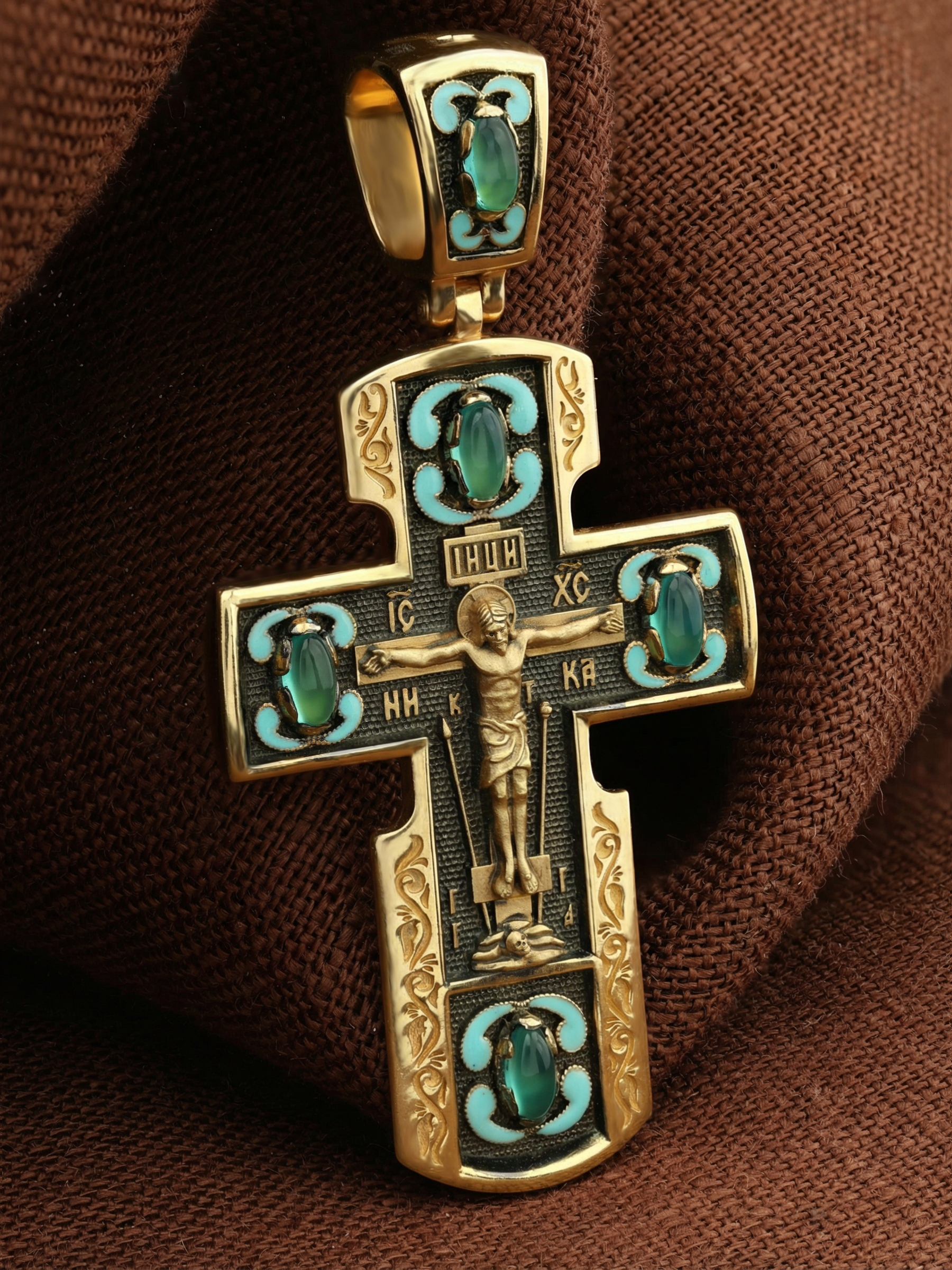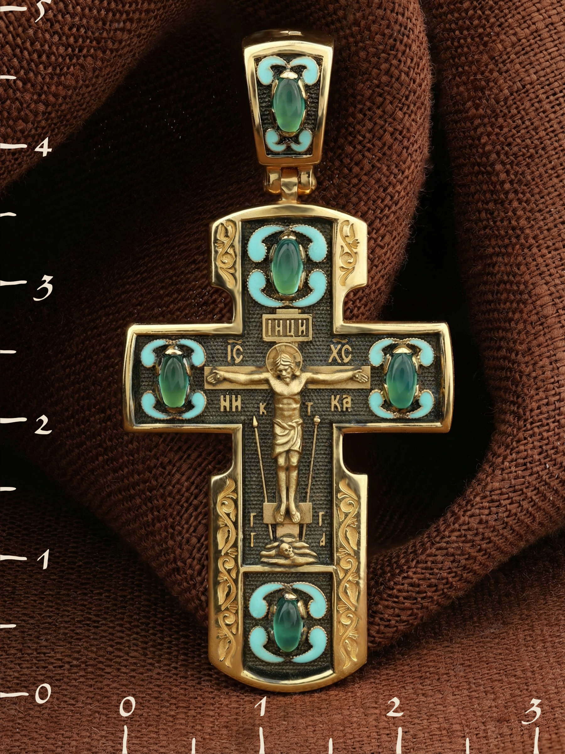 На лицевой стороне креста изображено Распятие Господа и Спасителя нашего Иисуса Христа, отдавшего Себя на смерть, чтобы другие могли жить — жить вечной жизнью, жить с Богом. Через крестную жертву Бог раскрывает нам Свою безмерную любовь и призывает к ответной любви. Своею кровью Господь освятил крест и сделал его проводником Своей благодати, источником освящения верующих. На верхней табличке, выше головы Иисуса, расположена надпись, составленная Понтием Пилатом — «IНЦИ». Она означает «Иисус Назорей, Царь Иудейский». Надписи «IC» «ХС» — имя Иисуса Христа помещаются над средней перекладиной, под ней помещено слово «Ника», что означает Победитель. Крест стоит на горе камней, символизирующих Голгофу, которая обозначена надписью «Г.Г». В ее основании различается череп — это голова Адама, обозначенный надписью «Г.А». Вдоль креста изображены орудия Страстей Христовых: копие сотника Лонгина, которым пронзили подреберье мёртвого Иисуса, чтобы убедиться в Его смерти, и трость с губкой, с которой Иисуса напоили уксусом. Они обозначены буквами «К» и «Т».