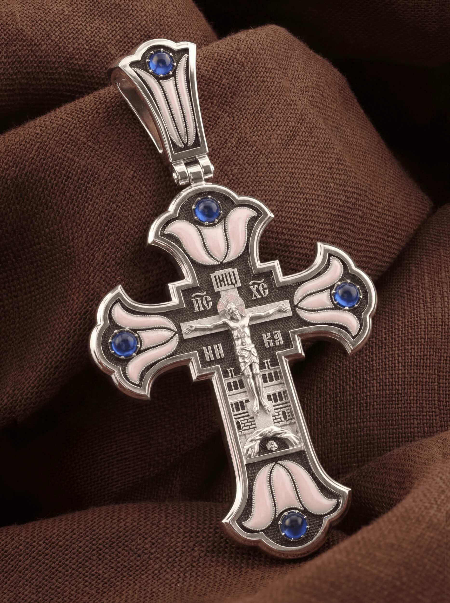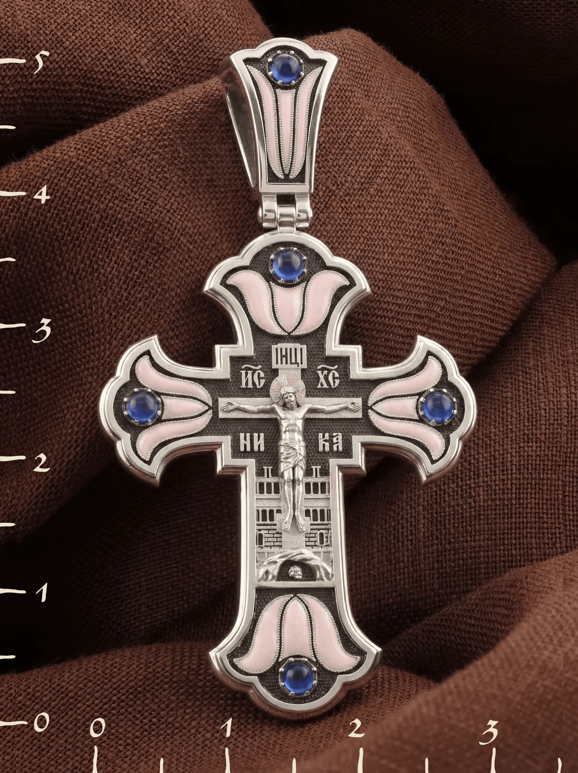 На лицевой стороне креста изображено Распятие Господа и Спасителя нашего Иисуса Христа. Христос, подвергнутый на кресте мучительной казни, своими страданиями искупил нас от древнего греха и даровал нам жизнь вечную. На верхней табличке, выше головы Иисуса, расположена надпись, составленная Понтием Пилатом — «IНЦI». Она означает «Иисус Назорей, Царь Иудейский». Надписи «IС» « ХС» означает Иисус Христос и слово «НИКА», что означает «победитель», помещается на разных сторонах поперечной перекладины креста. За крестом высится Иерусалимская стена, в знак того, что Господь был распят вне стен города. Крест стоит на горе камней, символизирующих Голгофу. Под подножием Креста изображена покоящаяся голова (череп) Адама, грехи которого Христос омыл Своею Кровью.