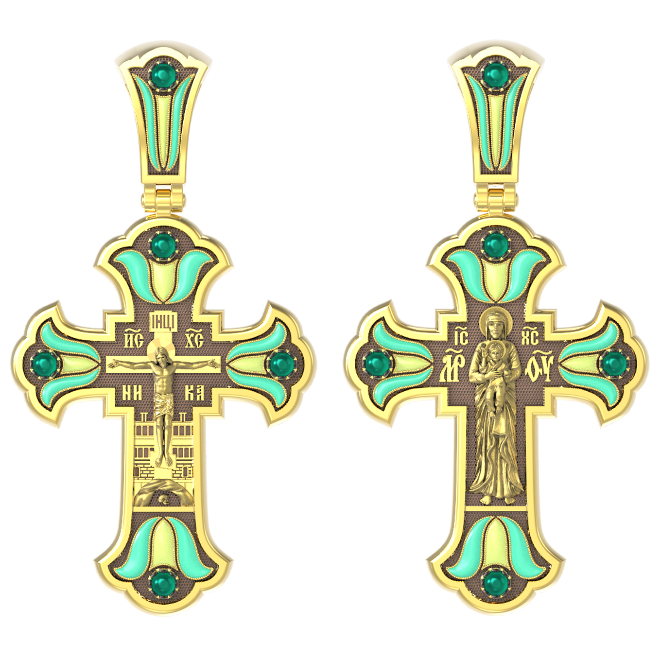 На лицевой стороне креста изображено Распятие Господа и Спасителя нашего Иисуса Христа. Христос, подвергнутый на кресте мучительной казни, своими страданиями искупил нас от древнего греха и даровал нам жизнь вечную. На верхней табличке, выше головы Иисуса, расположена надпись, составленная Понтием Пилатом — «IНЦI». Она означает «Иисус Назорей, Царь Иудейский». Надписи «IС» « ХС» означает Иисус Христос и слово «НИКА», что означает «победитель», помещается на разных сторонах поперечной перекладины креста. За крестом высится Иерусалимская стена, в знак того, что Господь был распят вне стен города. Крест стоит на горе камней, символизирующих Голгофу. Под подножием Креста изображена покоящаяся голова (череп) Адама, грехи которого Христос омыл Своею Кровью.
