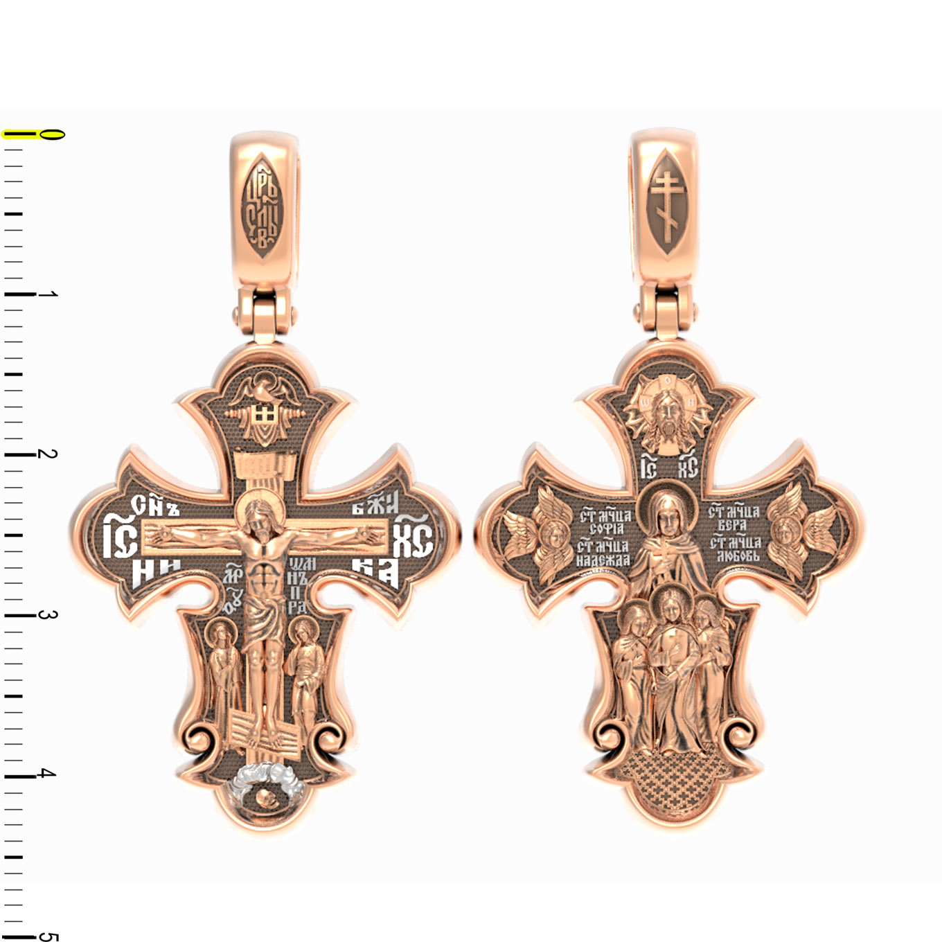 На оборотной стороне креста изображены Святые мученицы Вера, Надежда, Любовь и матерь их София, жившие во 2 веке нашей эры в Римской империи. Известно, что София была родом из Милана. Она рано овдовела, после чего перебралась в Рим. Своих дочерей София воспитывала в христианской вере и даже дала им имена в честь главных христианских добродетелей — Вера, Надежда и Любовь. В те годы римское государство жестоко преследовало верующих во Христа. Маленьких девочек (старшей Вере тогда было всего 12, а младшей Любови лишь 9) арестовали, подвергли истязаниям, а затем умертвили на глазах их матери. Сама София скончалась на следующий день у могилы своих дочерей. Но трагическая судьба на земле обернулась для мучениц вечной славой в ином мире. Церковь причислила их к лику святых и сегодня по молитвам к ним происходят чудеса. Выше образов мучениц изображен Спас Нерукотворный — образ Господа и Спасителя нашего Иисуса Христа, чудесно отпечатавшийся на плате, котором Христос вытер свой лик. По обеим сторонам креста изображены Ангелы Серафимы. На кулонном кольце помещен крест.