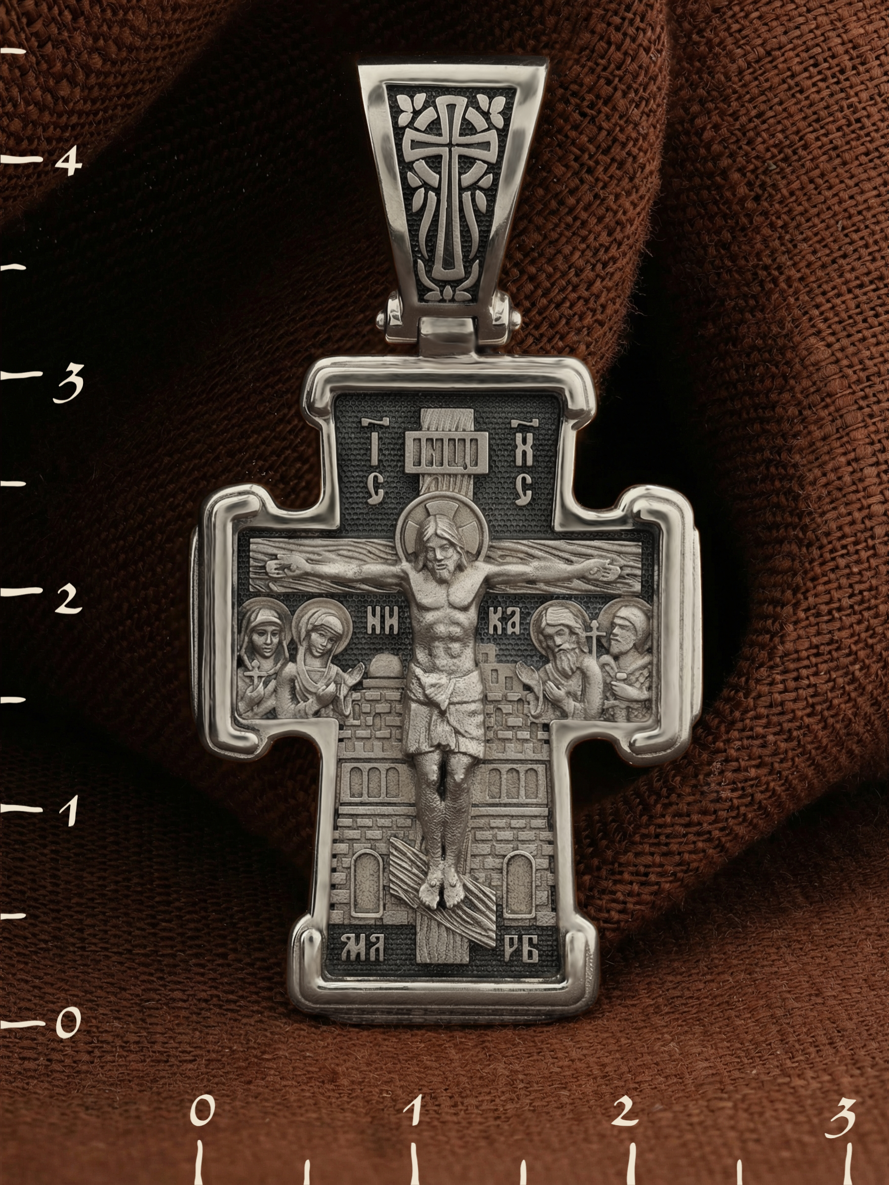 На лицевой стороне креста изображено Распятие Господа и Спасителя нашего Иисуса Христа. Крест- символ спасения и искупления рода человеческого, знамение победы над смертью и адом. Иисус Христос, как искупительная жертва освобождения человечества от власти греха, умер крестной смертью и в третий день воскрес. На верхней табличке, выше головы Иисуса, расположена надпись, составленная Понтием Пилатом — «IНЦI». Она означает «Иисус Назорей, Царь Иудейский». Рядом расположена надпись «IС» « ХС». Она означает Иисус Христос. Ниже — слово «НИКА», что означает «победитель». Слева от Распятия — Пресвятая Богородица и святая мироносица Мария Магдалина с крестом в руке. Справа — апостол и евангелист Иоанн Богослов, один из ближайших учеников Иисуса Христа, и сотник Лонгин с крестом в правой руке и копьем — в левой. За крестом высится Иерусалимская стена. Надпись «МЛРБ» — «место лобное рай бысть» означает, что место лобное стало раем, помещается в нижней части креста. На кулонном кольце помещен крест.