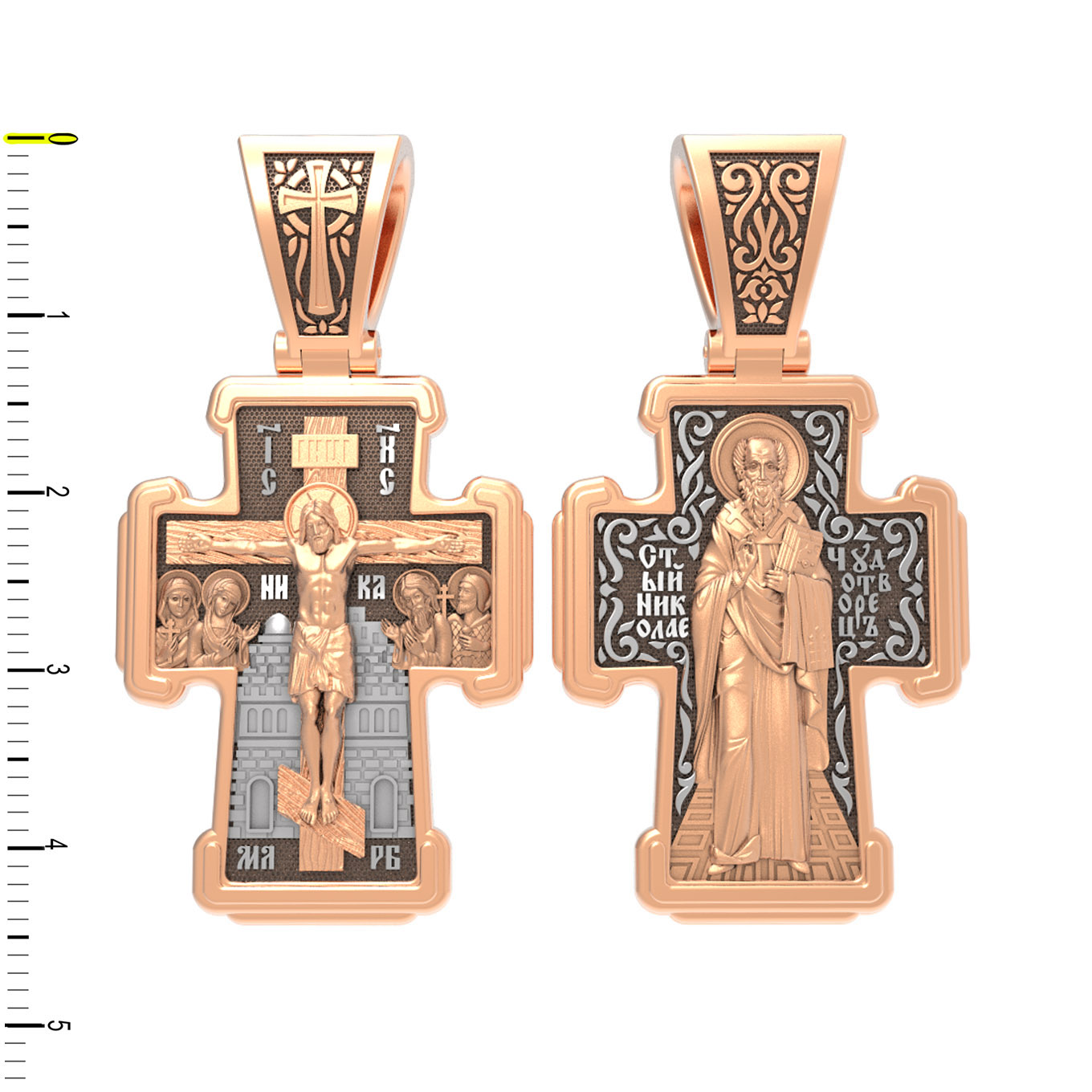 На лицевой стороне креста изображено Распятие Господа и Спасителя нашего Иисуса Христа. Крест- символ спасения и искупления рода человеческого, знамение победы над смертью и адом. Иисус Христос, как искупительная жертва освобождения человечества от власти греха, умер крестной смертью и в третий день воскрес. На верхней табличке, выше головы Иисуса, расположена надпись, составленная Понтием Пилатом — «IНЦI». Она означает «Иисус Назорей, Царь Иудейский». Рядом расположена надпись «IС» « ХС». Она означает Иисус Христос. Ниже — слово «НИКА», что означает «победитель». Слева от Распятия — Пресвятая Богородица и святая мироносица Мария Магдалина с крестом в руке. Справа — апостол и евангелист Иоанн Богослов, один из ближайших учеников Иисуса Христа, и сотник Лонгин с крестом в правой руке и копьем — в левой. За крестом высится Иерусалимская стена. Надпись «МЛРБ» — «место лобное рай бысть» означает, что место лобное стало раем, помещается в нижней части креста. На кулонном кольце помещен крест.