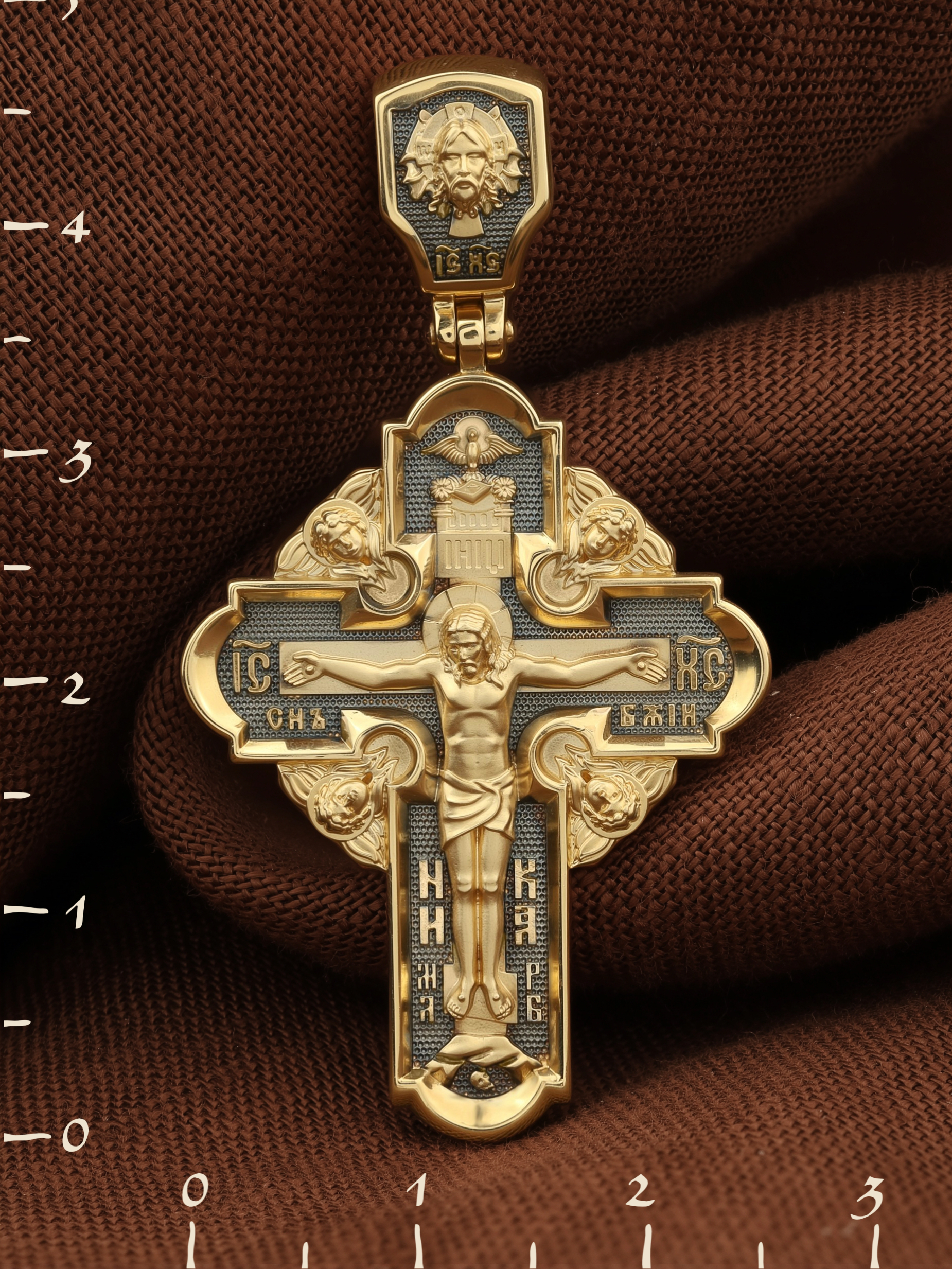 На лицевой стороне креста изображено Распятие Господа и Спасителя нашего Иисуса Христа. Крест- символ спасения и искупления рода человеческого, знамение победы над смертью и адом. Верхняя перекладина символизирует титло — табличку, на которой, согласно Евангелию, было начертано: Иисус Назорей Царь Иудейский (IНЦI). Надпись «IC» «ХC», означает Иисус Христос, помещается на разных сторонах поперечной перекладины креста. Ниже перекладины расположено словосочетание «СЫН БОЖИЙ», что означает божественную природу Иисуса Христа. Надпись «МЛРБ» — «место лобное рай бысть» означает, что место лобное стало раем и помещаются в нижней части креста. Рядом — слово «НИКА», что означает «победитель». Возвышение, на котором стоит Крест, символизирует гору Голгофу, на которой произошло Распятие. Под подножием Креста изображена покоящаяся голова (череп) Адама. На кулонном кольце изображен Нерукотворный образ Господа и Спасителя нашего Иисуса Христа, чудесно отпечатавшийся на плате, которым Христос вытер свой лик.