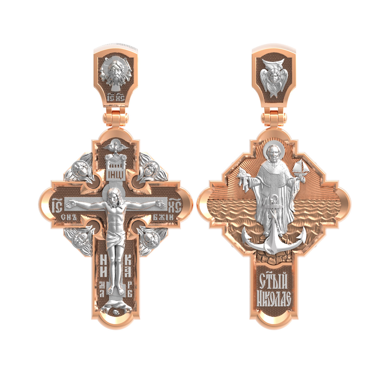 На лицевой стороне креста изображено Распятие Господа и Спасителя нашего Иисуса Христа, отдавшего Себя на смерть, чтобы другие могли жить — жить вечной жизнью, жить с Богом. Своею кровью Господь освятил крест и сделал его проводником Своей благодати, источником освящения верующих. На верхней табличке, выше головы Иисуса, расположена надпись, составленная Понтием Пилатом — «ИНЦИ». Она означает «Иисус Назорей, Царь Иудейский». Надпись «IС ХС» означает Иисус Христос помещается на разных сторонах поперечной (большой) перекладины креста. На кулонном кольце помещено изображение Духа Святого в виде голубя, сходящего с Небес