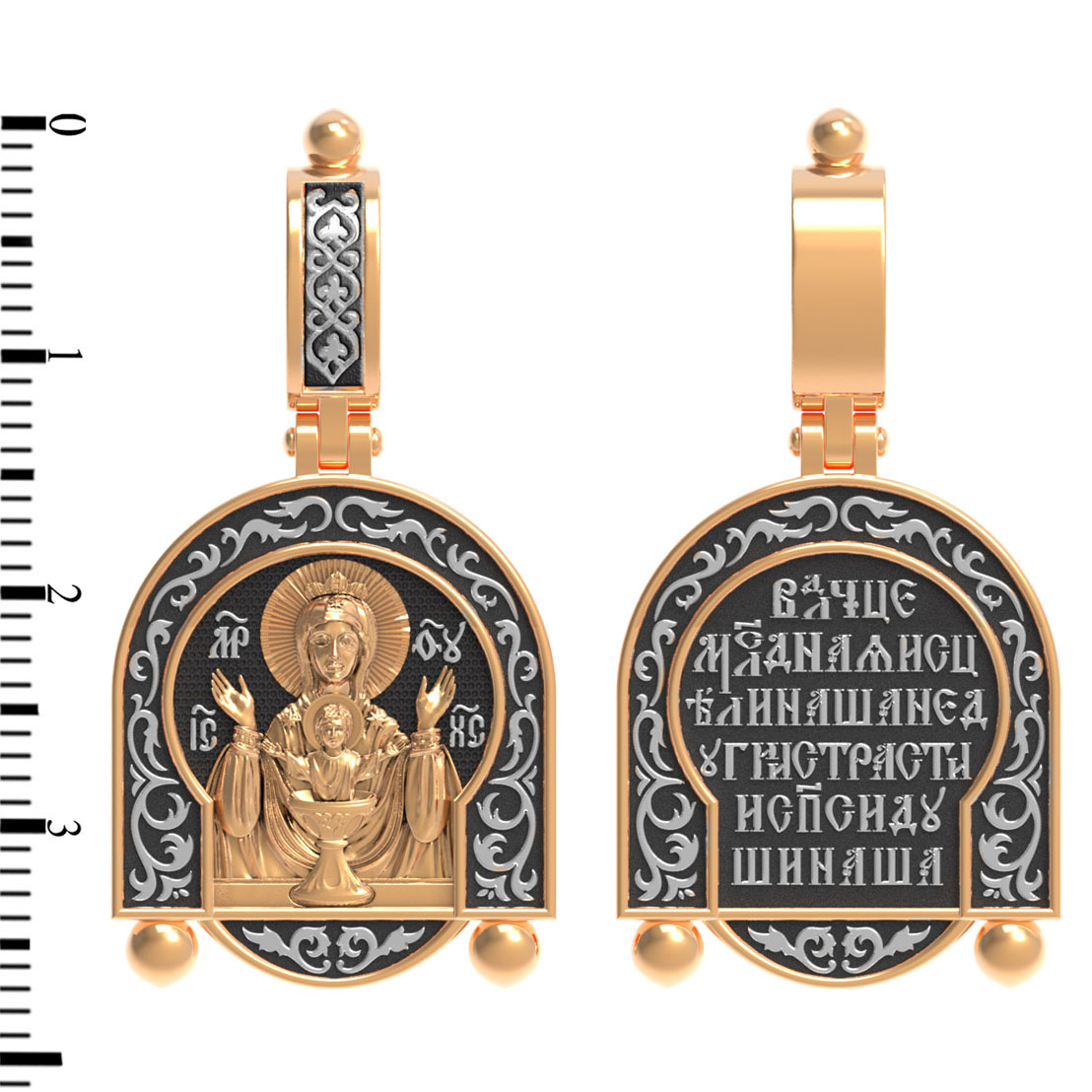 На лицевой части образка изображена икона Божией Матери «Неупиваемая чаша». Икона славится помощью в исцелении зависимостей, помогает людям обрести свободу от греховных страстей.