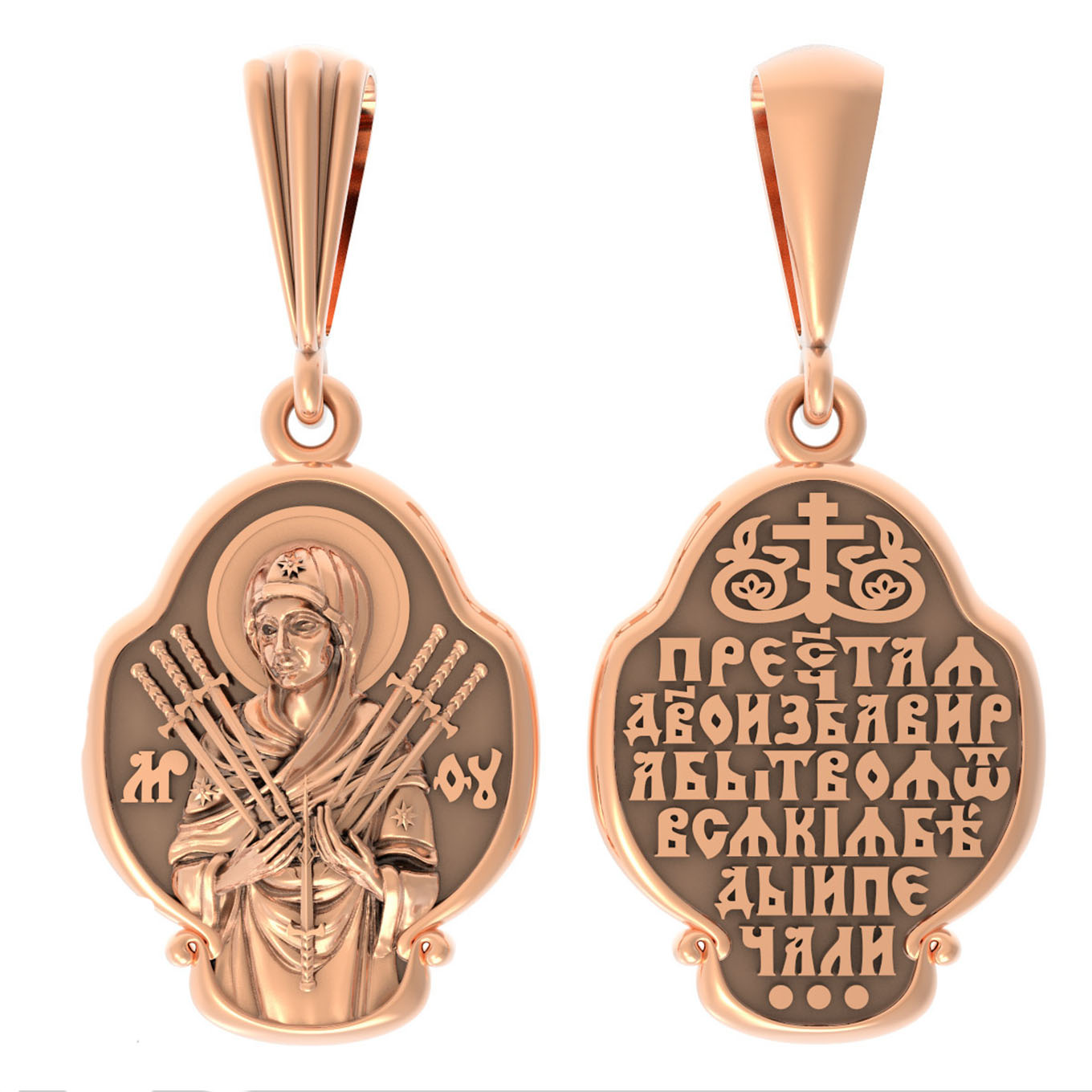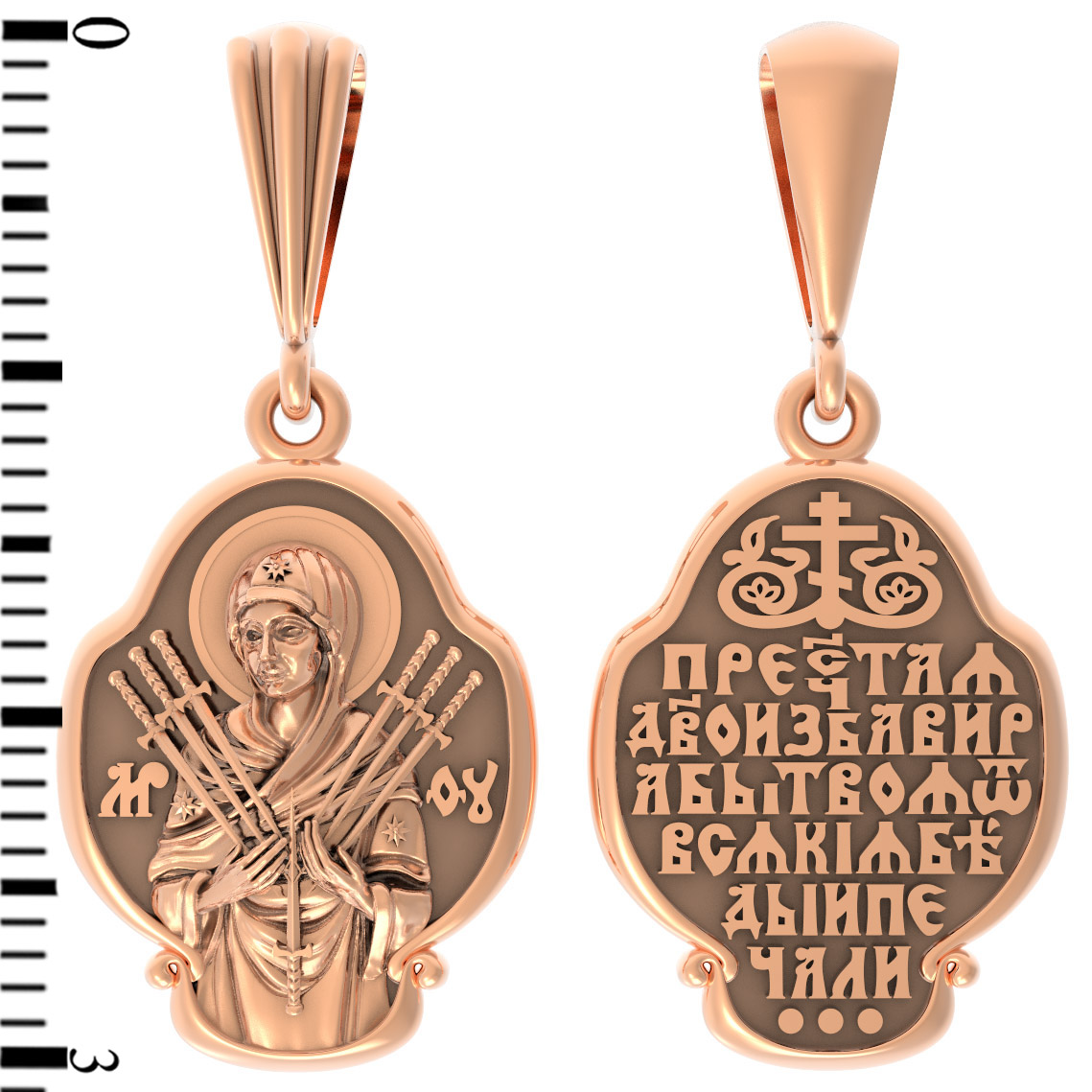 На лицевой стороне образка изображена икона Пресвятой Богородицы «Семистрельная» — одна из самых чудотворных икон на Руси. На протяжении многих веков христиане взывали к Царице Небесной через эту икону, если в стране начинались войны или мятежи.