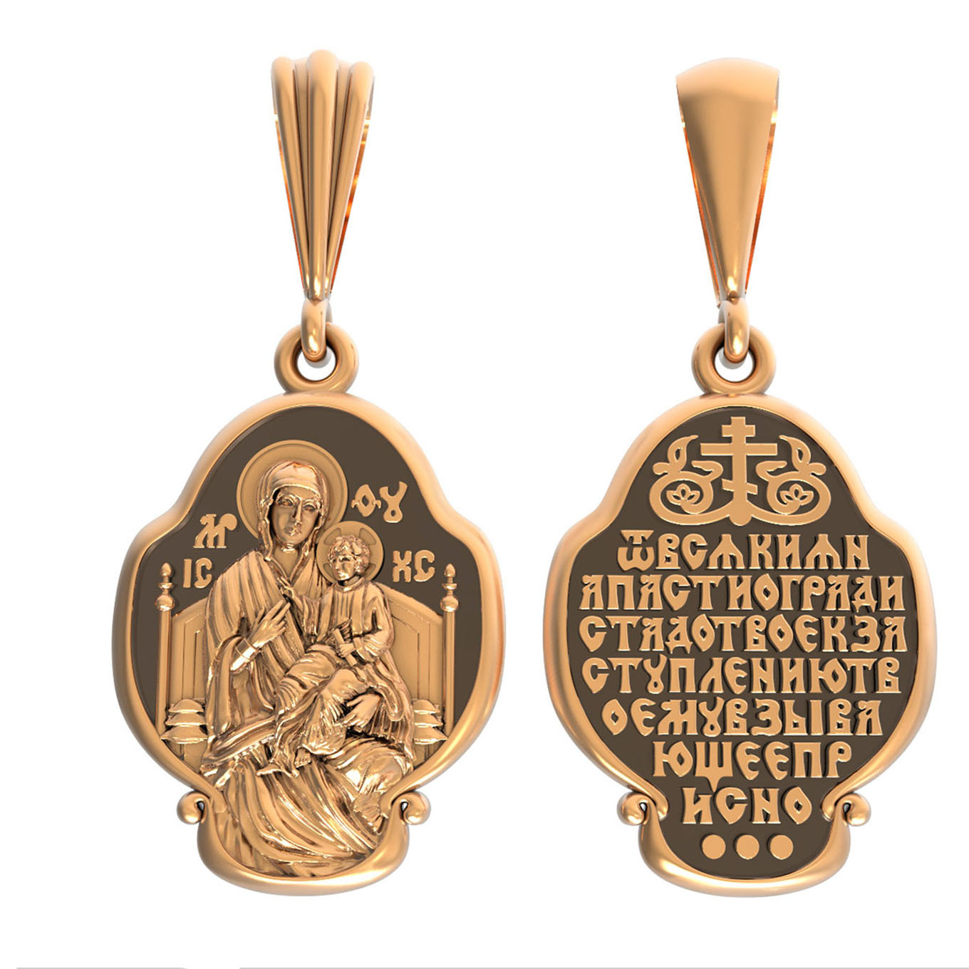 На обороте образка написана молитва Богородице в честь Ее иконы «Всецарица» (Пантанасса): «От всякия напасти огради стадо Твое, к заступлению Твоему взывающее присно».