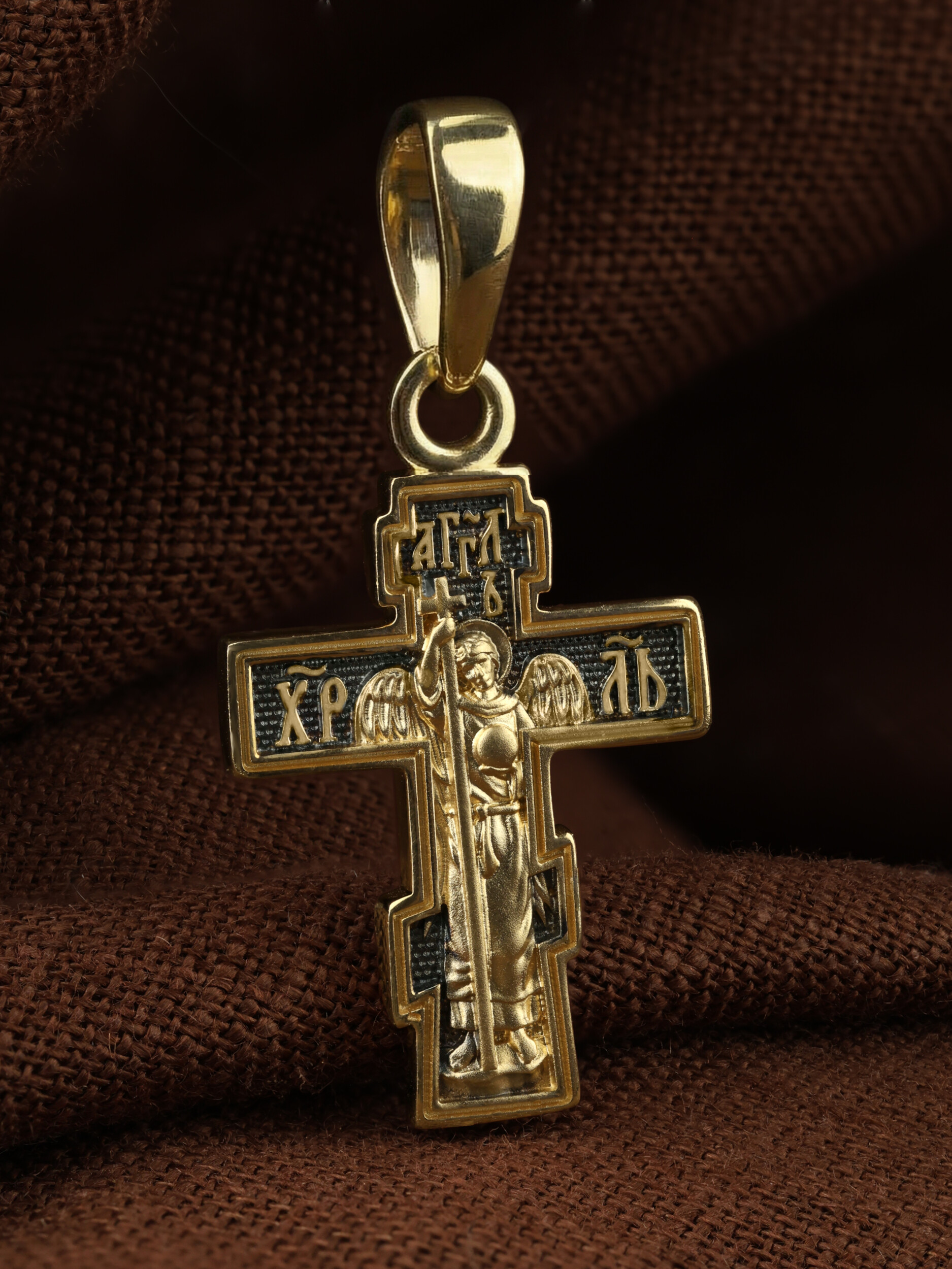На оборотной стороне креста изображен святой Ангел-Хранитель в виде прекрасного юноши держащего в правой руке крест, а в левой — сферу. Ангел-Хранитель — это Ангел приставляемый Богом к человеку при крещении для охраны и помощи в добрых делах. Невидимо пребывая при нас постоянно, он, руководствуя нас ко спасению, не только по нашему желанию таинственно наставляет нас на все доброе и полезное, не только возносит наши молитвы к Богу, но еще и сам от себя охраняют и защищают нас от врагов видимых и невидимых, ходатайствует за нас пред Богом.