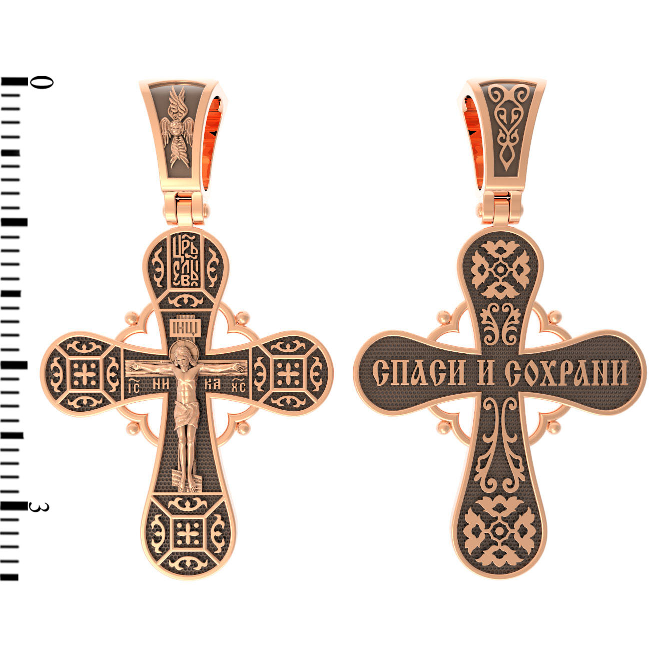 На обороте данного креста, в окружении изящного растительного узора, написано молитвенное славословие: «Спаси и сохрани».