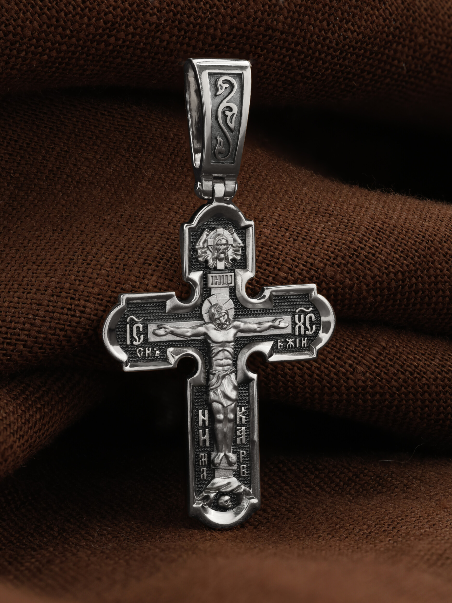 На лицевой стороне нательного креста по традиции изображено Распятие Господа нашего Иисуса Христа. Крест Господень стоит на небольшом каменистом возвышении, символизирующем гору Голгофу, которая обозначена буквами МЛРБ (Место Лобное Рай Бысть). Над головой Господа на поперечной перекладине написано «ИНЦИ», что символизирует табличку, которая была прибита к Кресту, с надписью «Иисус Назорей Царь Иудейский». Этим иудеи хотели посмеяться над Христом, не зная, что распинают истинного Царя всех царей. По сторонам основной перекладины расположены позолоченные рельефные инициалы Христа «ИС ХС». Под перекладиной, по сторонам древа, находится надпись «СЫН БОЖИЙ», а в основании креста — надпись «НИКА» (Победитель).
