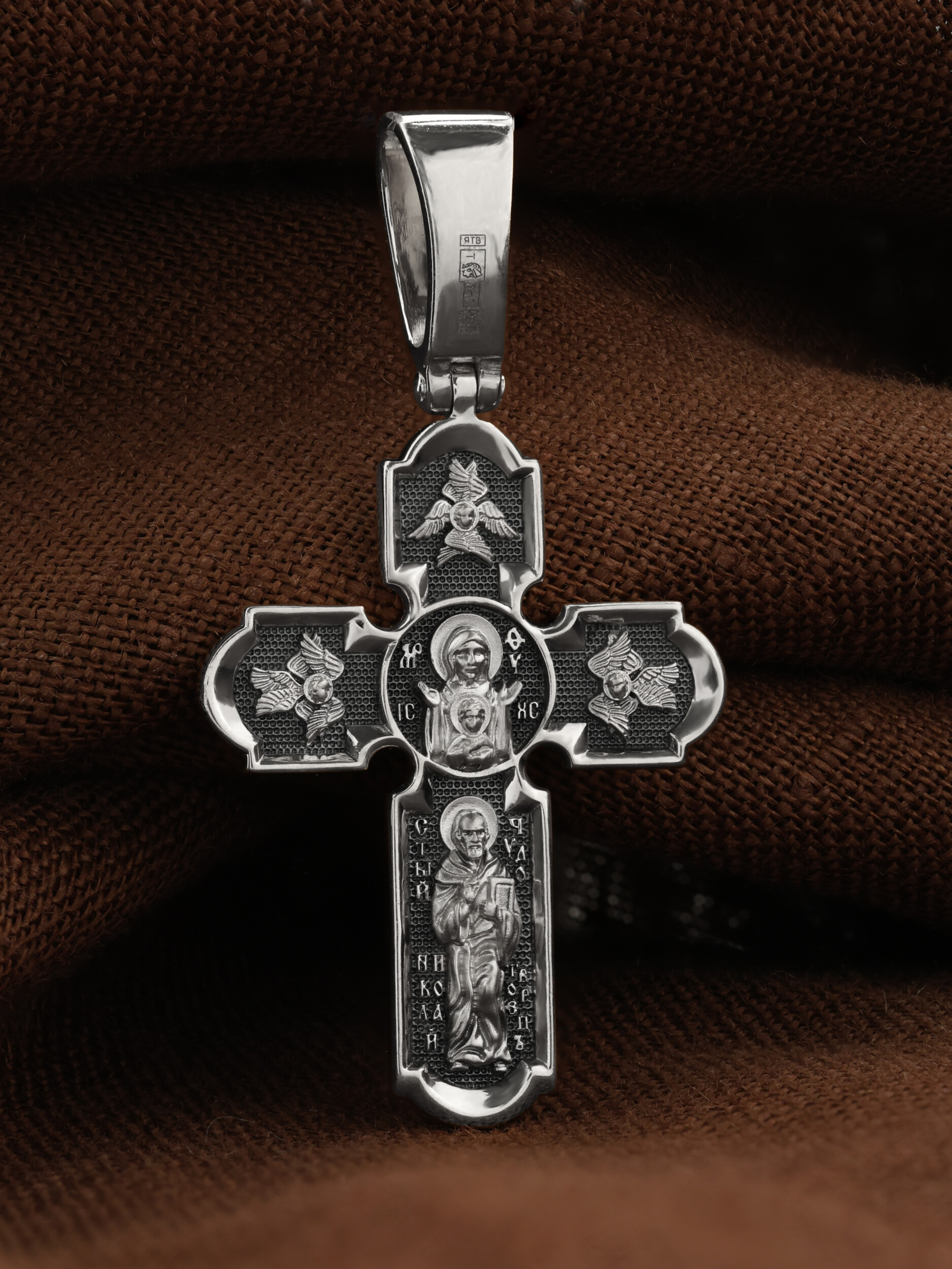 У основания креста в полный рост изображен самый любимый святой Православной Церкви — Николай Чудотворец. Святой почитается как целитель болезней, покровитель путешествующих, особенно по морю, помощник в торговле, учебе, а также в поисках достойного супруга.