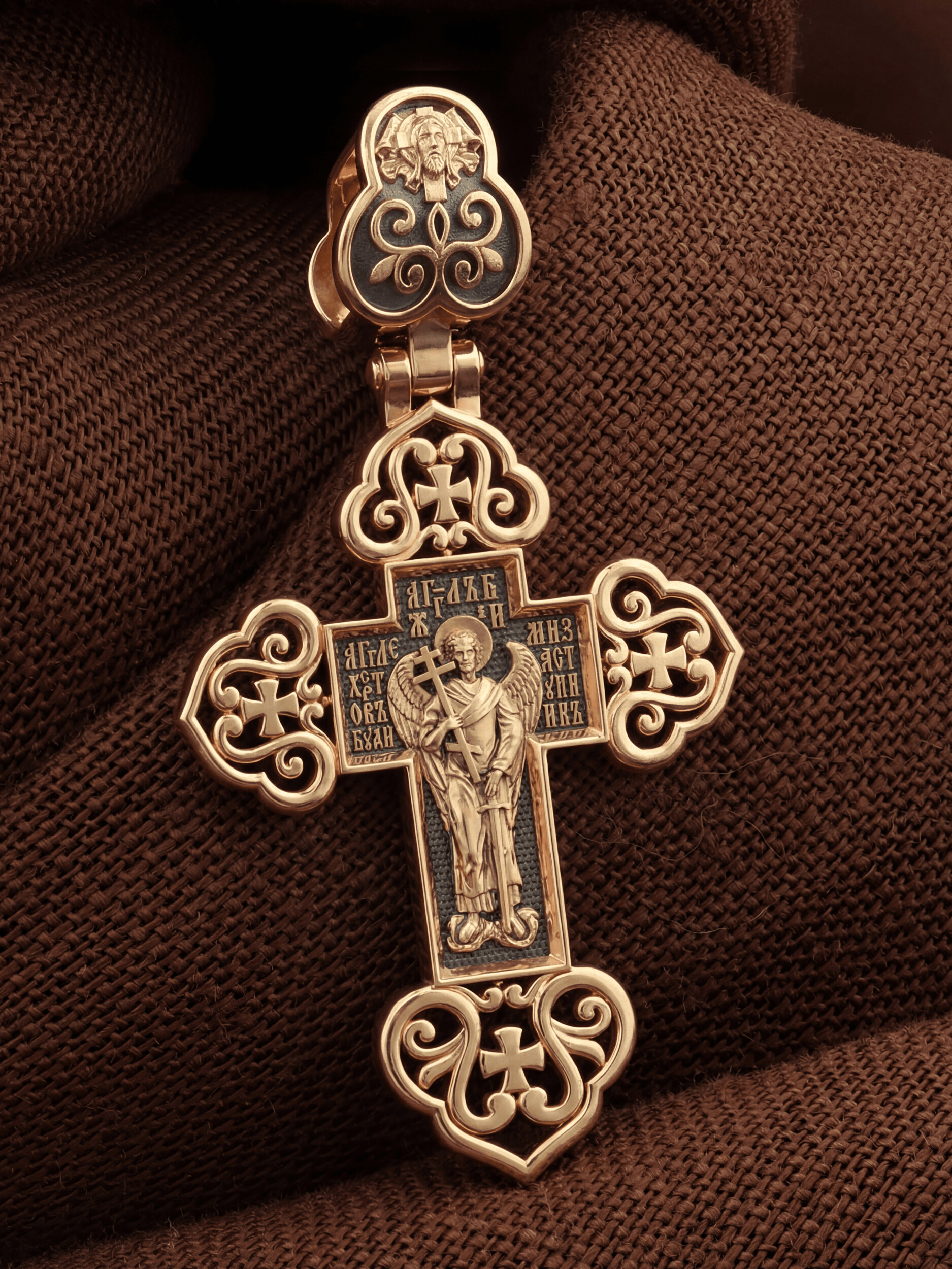 Оборотную сторону креста возглавляет Ангел Хранитель с крестом и мечом: ими он защищает человека от злых духовных и физических нападений. Ангел не может нарушить свободу воли человека, поэтому его надо молитвенно просить о помощи: «Ангеле Христов, буди ми заступник», — эта молитва написана вокруг его образа. На кулонном кольце изображен Спас Нерукотворный — Символ вочеловечившегося Божества.