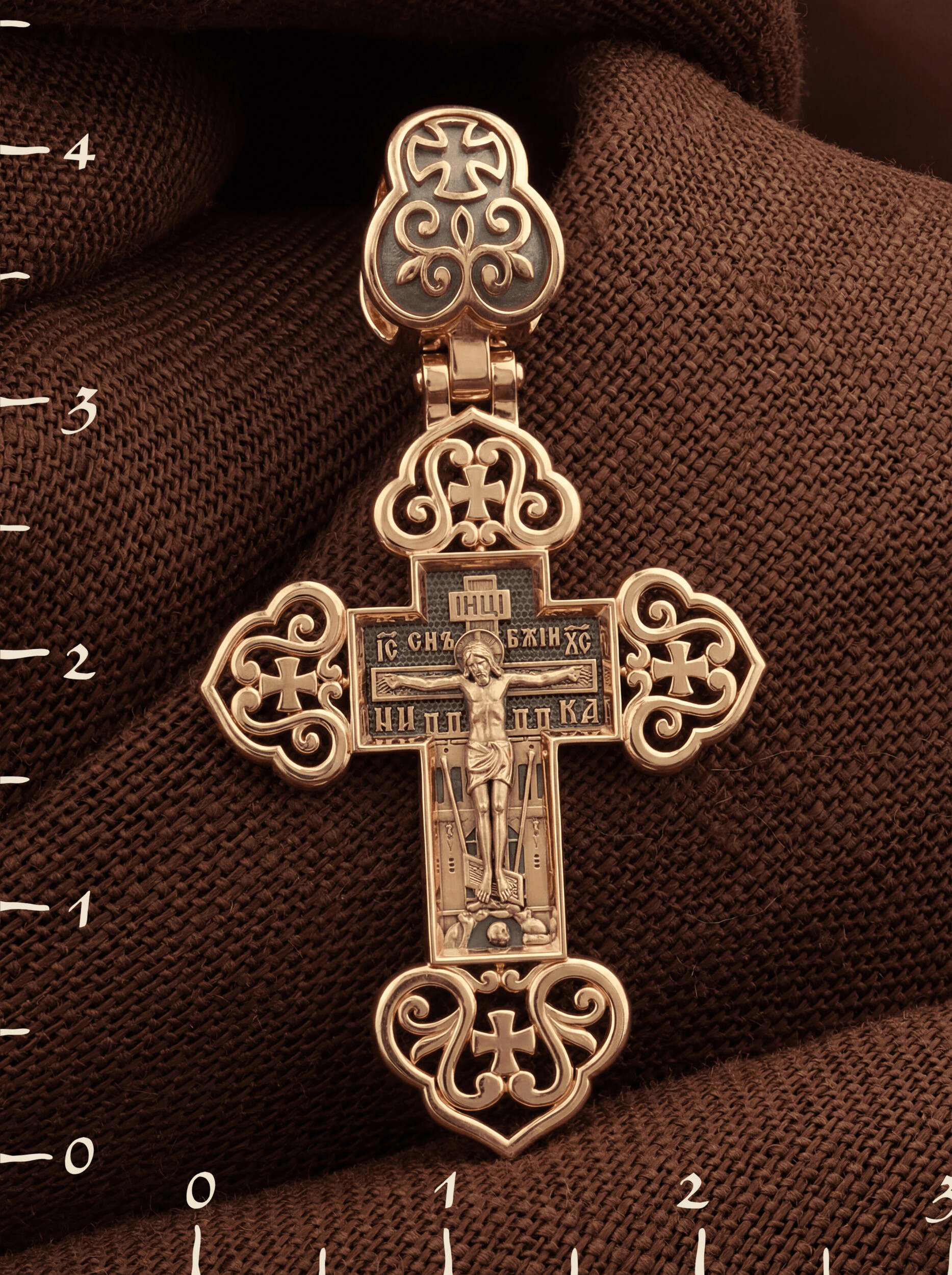 На лицевой стороне изображено Распятие. Над титлом видим слова «ЦРЬ СЛВЫ» — Царь Славы. Верхняя перекладина символизирует собой табличку с надписью «IHЦI» — Иисус Назарянин Царь Иудейский. Над перекладиной пишется сокращенно имя Спасителя «IC XC» — Иисус Христос и словосочетание «СНЪ БЖIЙ» — СЫН БОЖИЙ. Ниже перекладины добавляется «НИКА» (греч. — Победитель). Возвышение, на котором стоит Крест, символизирует гору Голгофу, на которой произошло Распятие. У подножия Креста изображают прах Адама, обозначенный черепом. Рядом с Крестом из горы выступают орудия страданий Господа — трость и копие, обозначенные буквами Т и К.