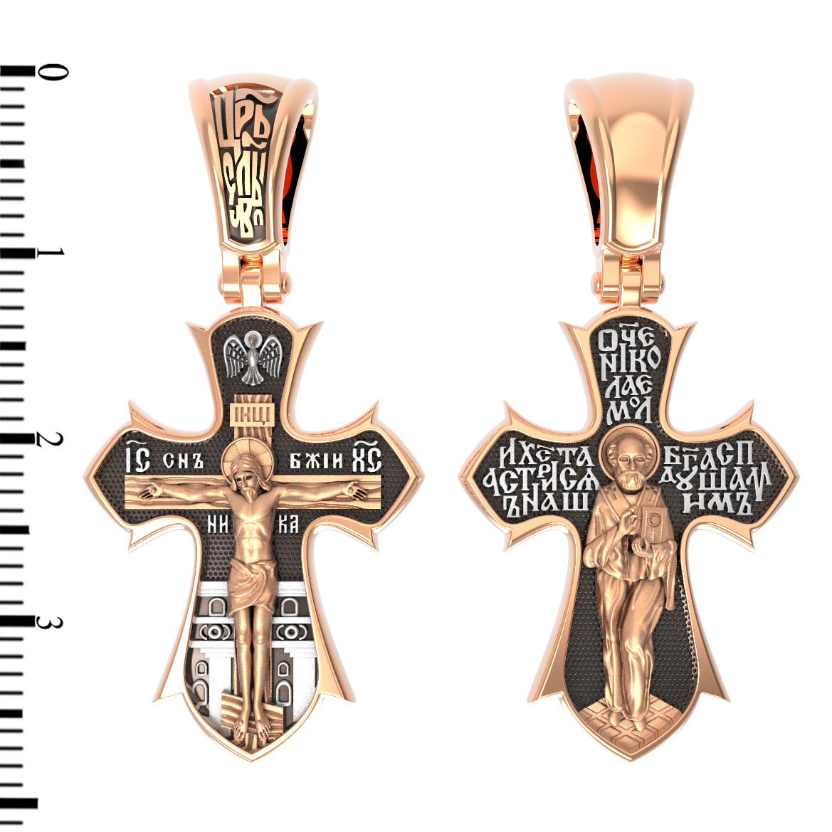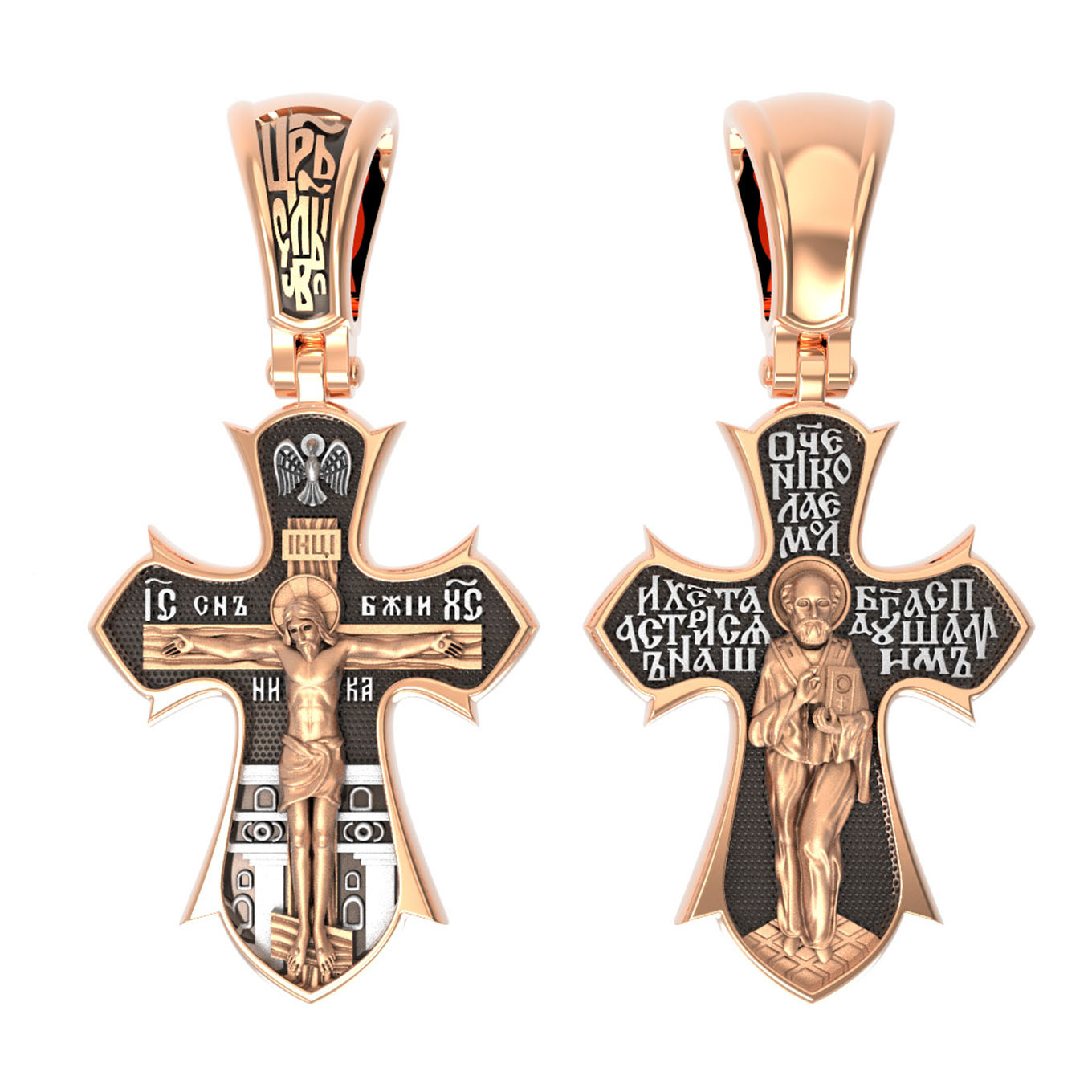 На лицевой стороне креста изображено распятие Господа нашего Иисуса Христа. Позади Распятия видна иерусалимская стена, знак того, что Господь был распят вне стен города. Но вместе с тем стена символизирует и Небесный Иерусалим, путь который открылся для человека через Голгофу. На кулоном кольце видим слова «ЦРЬ СЛВЫ» — Царь Славы. Верхняя перекладина символизирует собой табличку с надписью «IHЦI» — Иисус Назарянин Царь Иудейский. Над перекладиной пишется сокращенно имя Спасителя «IC XC» — Иисус Христос и словосочетание «СНЪ БЖIЙ» — «СЫН БОЖИЙ». Рядом с образом Христа помещены слова — «НИКА» (греч. — Победитель). Возвышение, на котором стоит Крест, символизирует гору Голгофу, на которой произошло Распятие. У подножия Креста изображают прах Адама, обозначенный черепом.