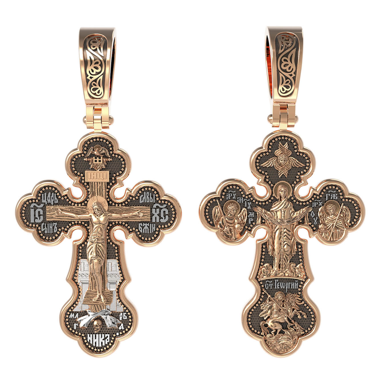 Центральную часть оборотной стороны креста украшает икона Божией Матери «Покров Пресвятой Богородицы». Праздник Покрова Пресвятой Богородицы пришел на Русь в XII веке из Византии и стал одним из самых почитаемых. Пресвятая Богородица простирает Свой молитвенный покров над всеми православными христианами и умоляет Сына своего о даровании вечного спасения каждому человеку. Над образом помещен шестикрылый Серафим. Справа помещено изображение Архангела Гавриила, слева- Архангела Михаила. На кресте внизу помещено изображение Святого Великомученика Георгия Победоносца — одного из самых почитаемых и удивительных святых. Он изображен как воитель, сидящий на вздыбленном коне и поражающий копьем огнедышащего змея. Змей символизирует собою сатанинские силы.