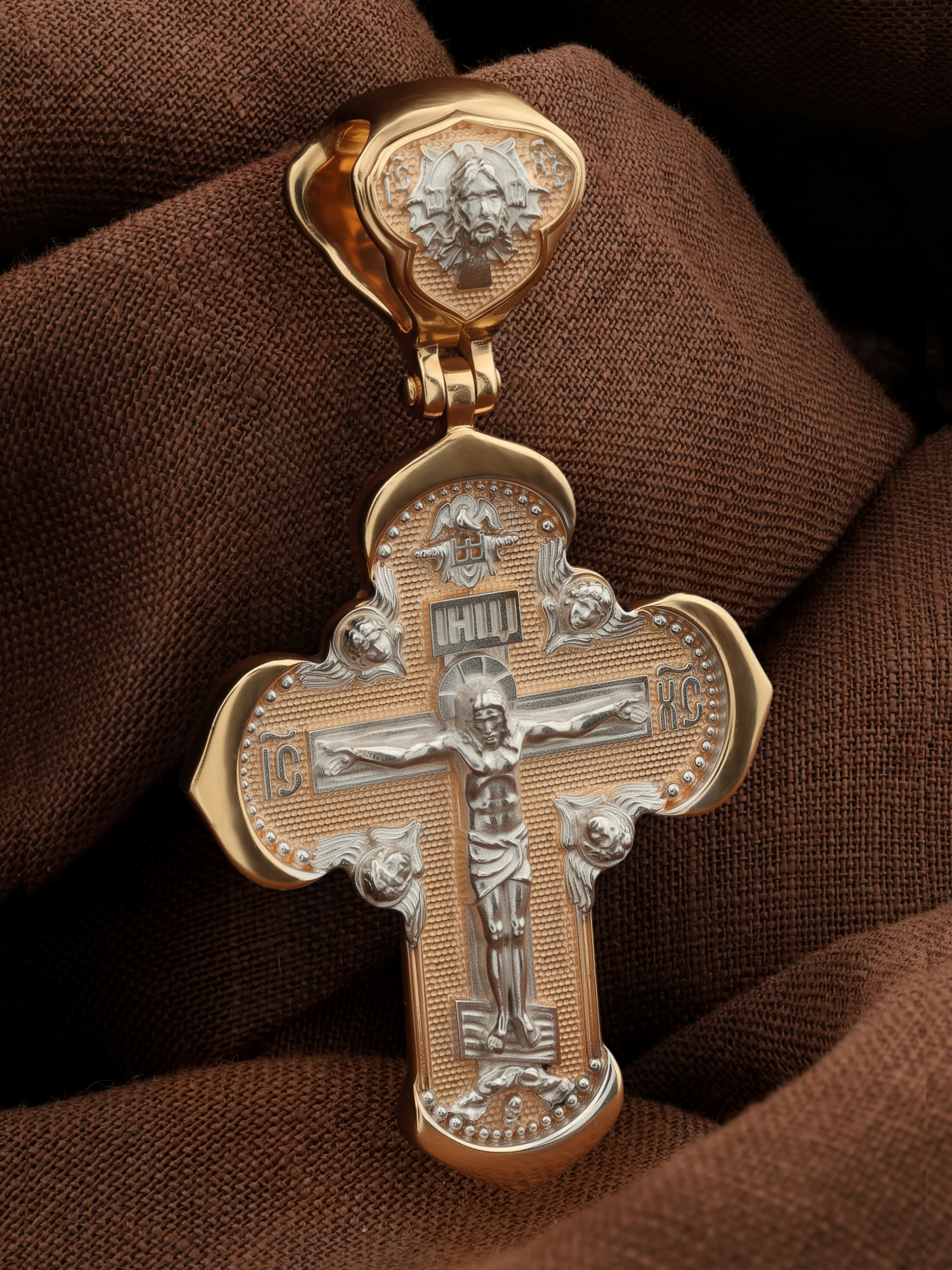 На лицевой стороне креста изображено Распятие Господа и Спасителя нашего Иисуса Христа, отдавшего Себя на смерть, для искупления грехов мира. Крест является символом жертвенной любви Всеблагого Бога к падшим людям, всепобеждающим духовным оружием христиан, основанием и средоточием церковной жизни. Господь сказал: «кто хочет идти за Мною, отвергнись себя, и возьми крест свой, и следуй за Мною». (Мк. 8: 34). На верхней табличке, выше головы Иисуса, расположена надпись, составленная Понтием Пилатом — «IНЦI». Она означает «Иисус Назорей, Царь Иудейский». Надпись «IC» «ХC», означает Иисус Христос, помещается на разных сторонах поперечной перекладины креста. Крест стоит на горе камней, символизирующих Голгофу. В ее основании различается череп– это голова Адама. На кулонном кольце изображен Нерукотворный образ Господа и Спасителя нашего Иисуса Христа, чудесно отпечатавшийся на плате, которым Христос вытер свой лик.