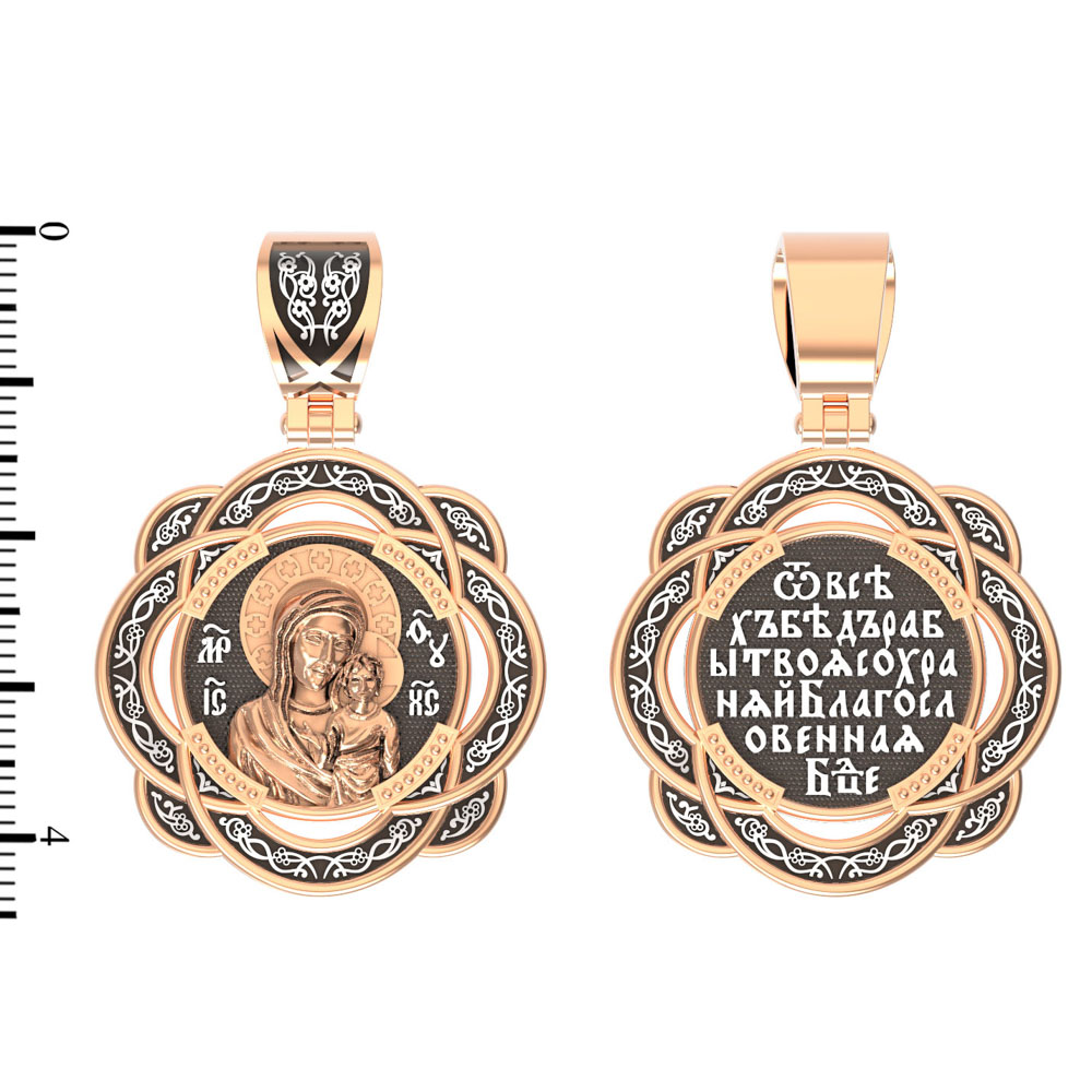 На лицевой части образка изображена Казанская икона Пресвятой Богородицы — одна из самых почитаемых в России. Икона была явлена на пожарище в Казани в 1579 году. В 1904 году святыня была похищена и уничтожена, но чудотворную силу иконы Богородица явила во многих ее списках. Молитва перед Казанской иконой Божьей Матери помогает во всех сложных случаях жизни, во всех печалях, невзгодах, скорбях.