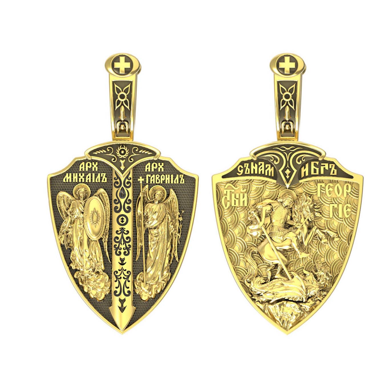 Основой композиции оборотной стороны является изображение Святого Георгия Победоносца. Святой Георгий один из наиболее почитаемых святых в Христианской Церкви. На Руси он известен как Юрий или Егорий, покровитель воинов. На образке изображено самое знаменитое чудо святого: спасение принцессы от змея, которому она предназначалась в жертву. Чудо это имеет символическое толкование. Принцесса означает душу человеческую, а змей — дьявола, желающего ее поглотить. Святой Георгий, небесный защитник, спускается с Небес, чтобы помочь душе избавиться от гибели. Образ святого воина венчают слова: «С нами Бог!». Они написаны у рукоятки меча, узорчатый клинок которого разделяет образок на две части. Сам образок имеет форму щита. Щит и меч — это символы духовной брани с дьяволом.