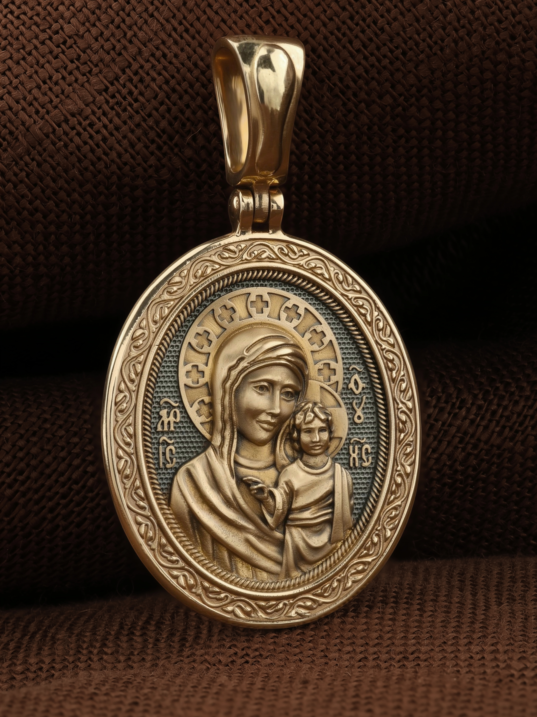 На обороте изображена Казанская икона Божией Матери — одна из самых почитаемых в России чудотворных икон Богородицы. Богословское значение Казанской иконы — указать верующим истинный Путь к спасению, который лежит через Христа. Только Божия Матерь имеет настолько сильное дерзновение к Спасителю, что может ходатайствовать перед Ним за всех верных. Именно этот образ дарится новой повенчанной паре, как хранитель очага и семейная реликвия. Молитва перед Казанской иконой Божьей Матери помогает во всех сложных случаях жизни, в болезнях, во всех печалях, невзгодах, скорбях. Уникальная история появления, чудеса, случившиеся по молитвам православных людей возле образа — все это делает Казанскую Богородицу особенной, среди тысяч других икон.