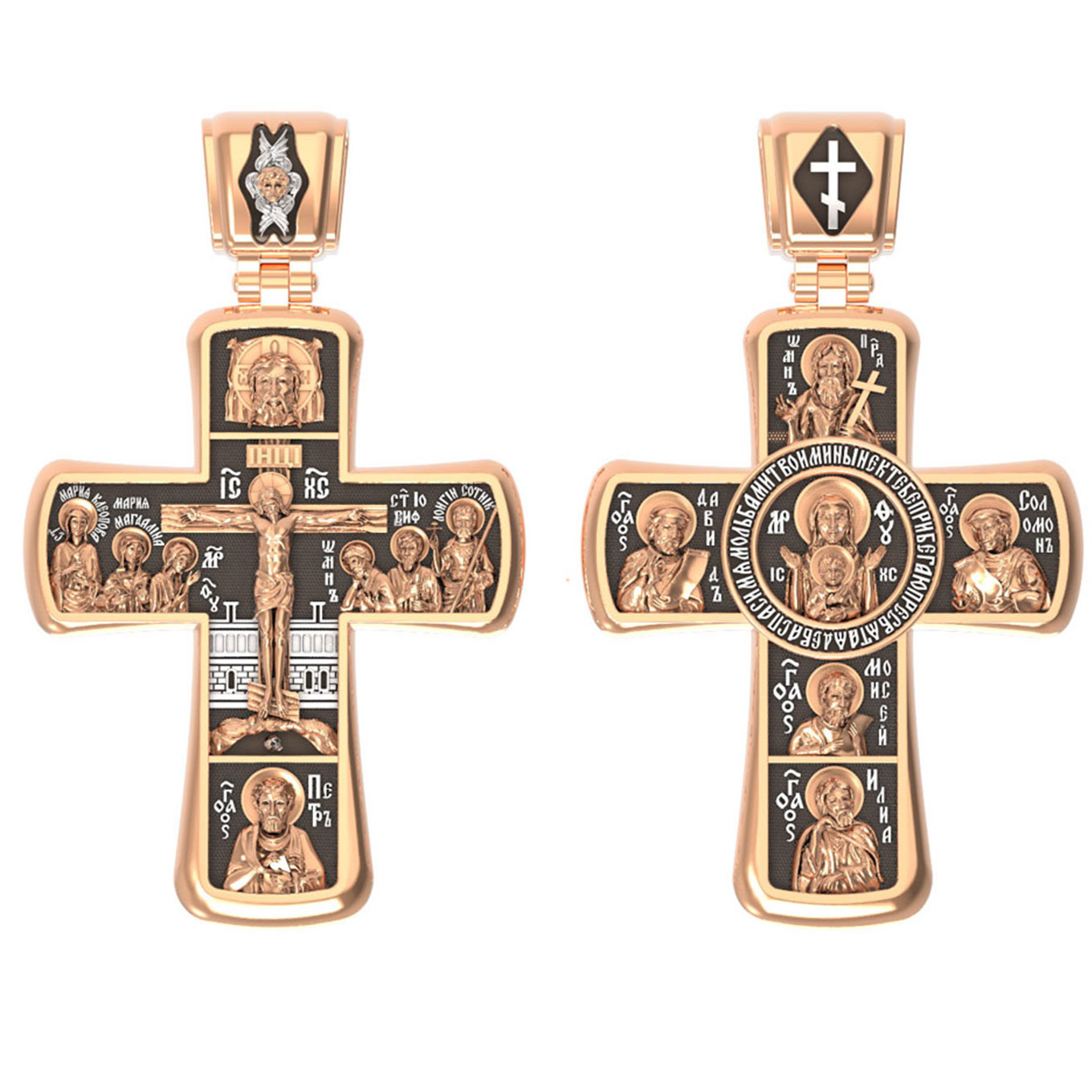 На лицевой стороне креста изображено Распятие Господа Иисуса Христа с предстоящими Ему святыми, которые, по преданию, находились у Креста Господа во время Его казни. Слева — Пресвятая Богородица и жены-мироносицы — равноапостольная Мария Магдалина и святая Мария Клеопова, справа — апостол Иоанн Богослов, прав. Иосиф Аримофейский и мч. Лонгин Сотник.