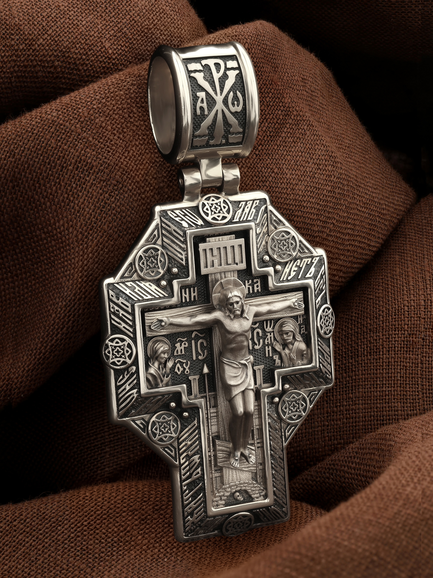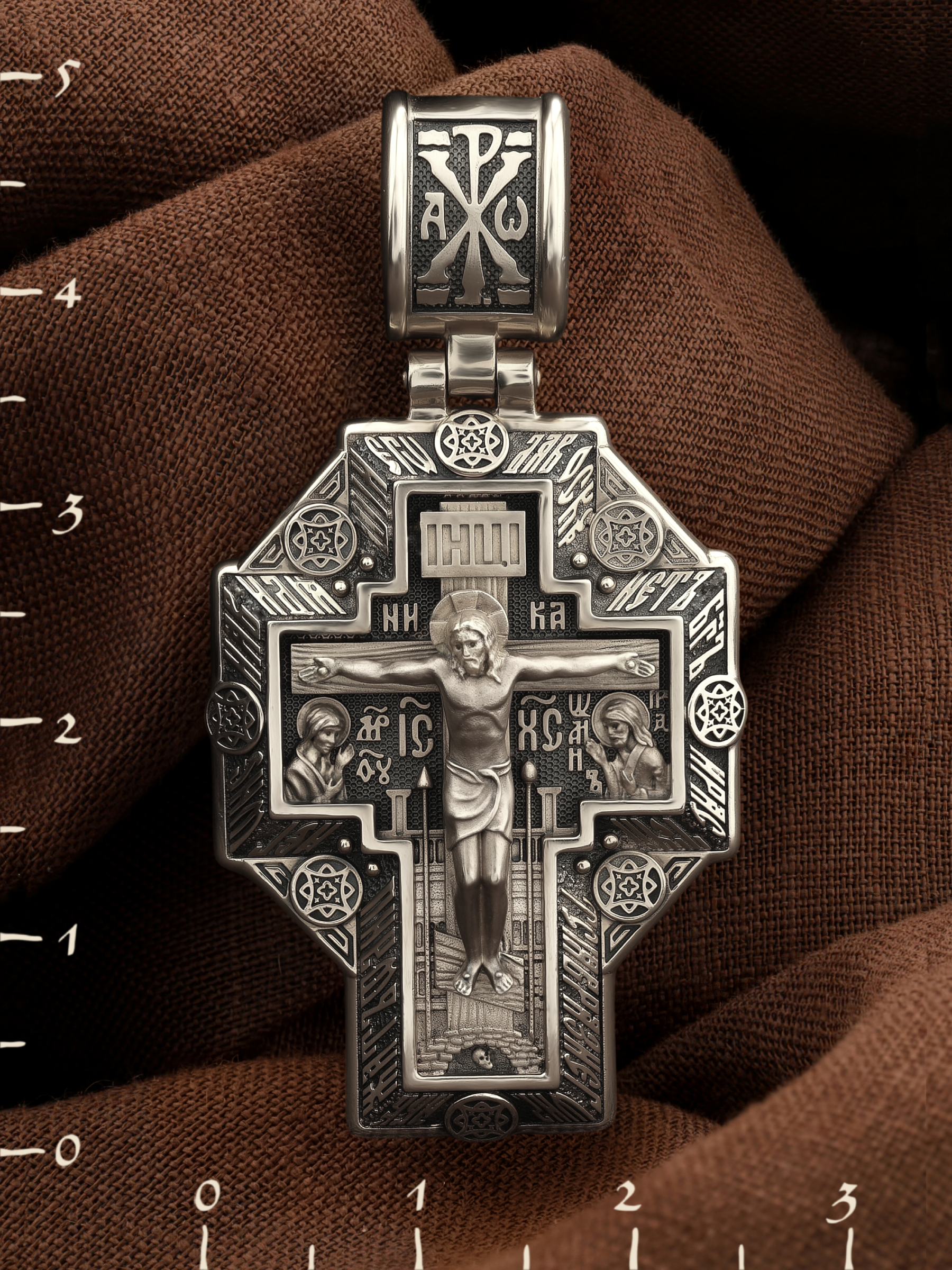 На лицевой стороне креста изображено Распятие Господа и Спасителя нашего Иисуса Христа. Крест- символ спасения и искупления рода человеческого, знамение победы над смертью и адом. Иисус Христос, как искупительная жертва освобождения человечества от власти греха, умер крестной смертью и в третий день воскрес. На верхней табличке, выше головы Иисуса, расположена надпись, составленная Понтием Пилатом — «ИНЦИ». Она означает «Иисус Назорей, Царь Иудейский». Над перекладиной написано слово «НИКА» (греч. — Победитель). Ниже перекладины написано сокращенно имя Спасителя «IC XC» — Иисус Христос. Крест стоит на горе камней, символизирующих Голгофу. В ее основании различается череп — это голова Адама. Справа от Распятия помещен лик Пречистой Богородицы. Слева изображен Пророк Предтеча и Креститель Господень Иоанн. Лицевая сторона креста обрамлена словами псалма: «Да воскреснет Бог, и расточатся врази Его, и да бежат от лица Его ненавидящии Его».