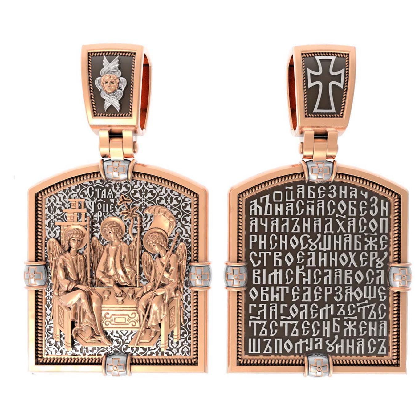 Основой композиции лицевой стороны является икона Святой Троицы.