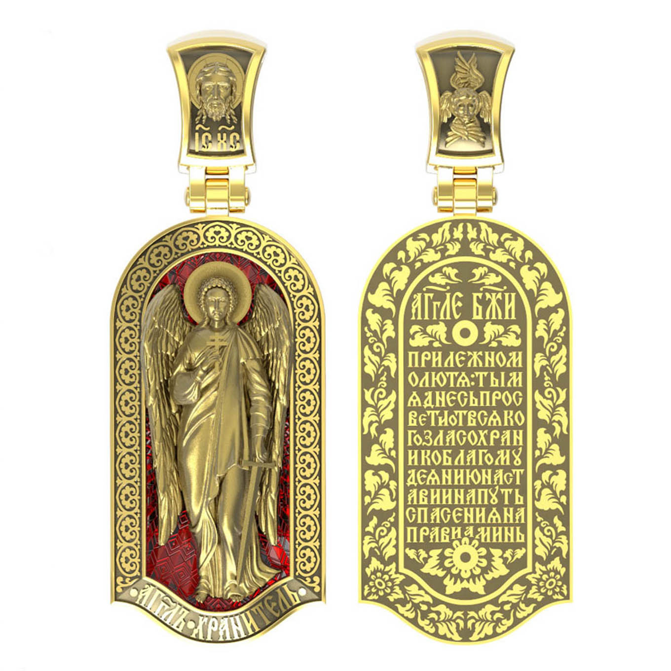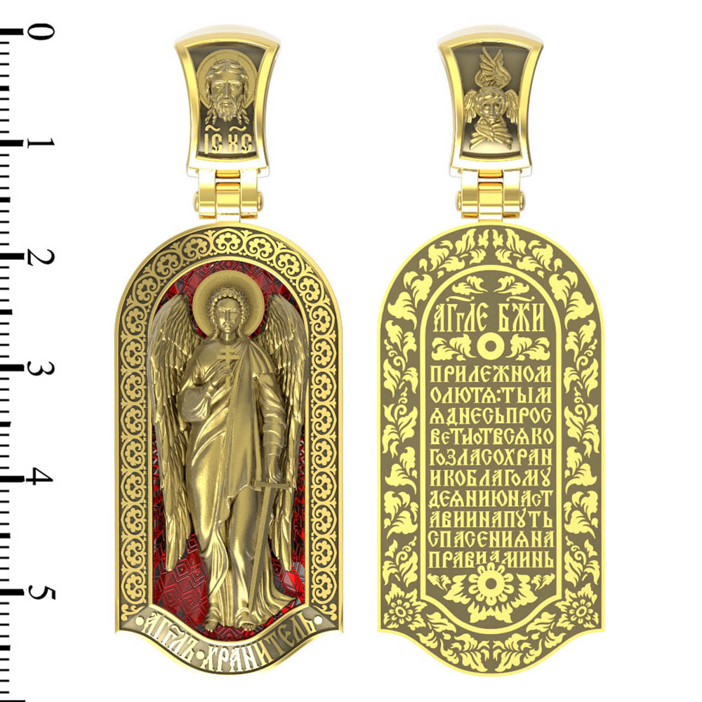 Основой композиции лицевой стороны является Ангела Хранителя. Образок Ангел Хранитель — это не просто украшение, а настоящая миниатюрная икона. В руках Ангел держит традиционные символические атрибуты Ангелов Хранителей: крест — знак послушания Христу и следования Его заповедям, меч — символ непримиримой борьбы, которую он ведет с бесами, отражая их нападения на людей. Слово «ангел» означает «вестник». Ангелы — верные служители Божьи, которых Господь посылает возвещать Свои повеления. Ангелы тварны, как и люди, но имеют другую природу. На иконах они изображаются в человеческом обличье с большими крыльями. Могучие крылья ангелов символизируют быстроту, с которой они исполняют повеления Бога, а небольшие ленточки у ушей –тороки, или слухи — показывают, что они всегда слышат Его голос.