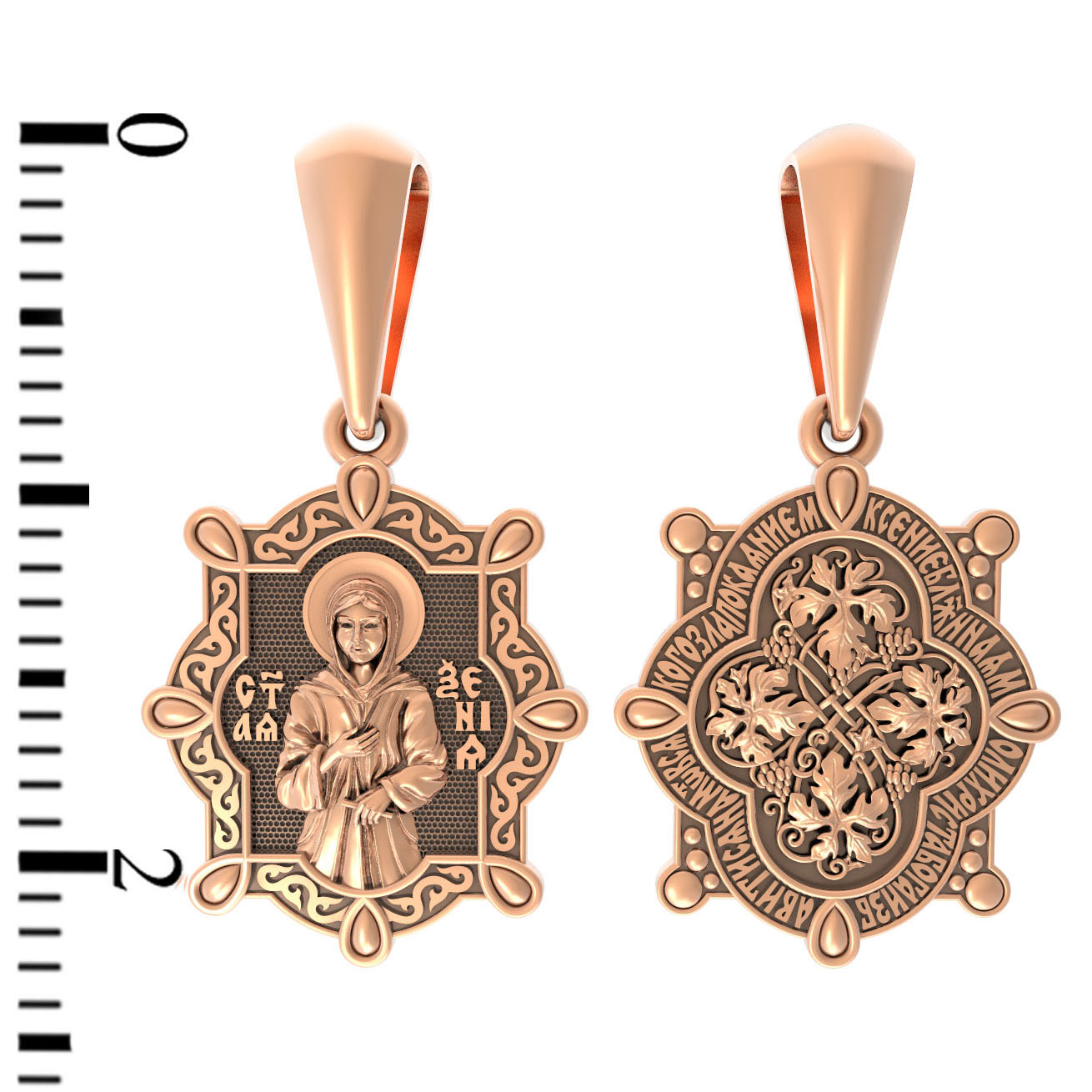 На лицевой стороне образка изображена Святая блаженная Ксения Петербургская, в миру Ксения Григорьевна Петрова.