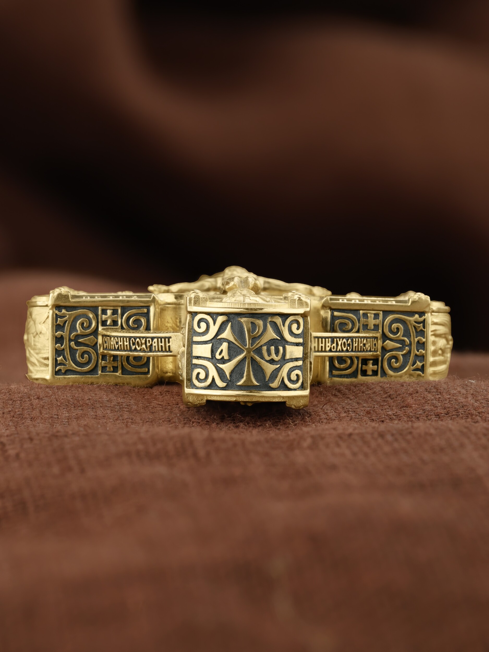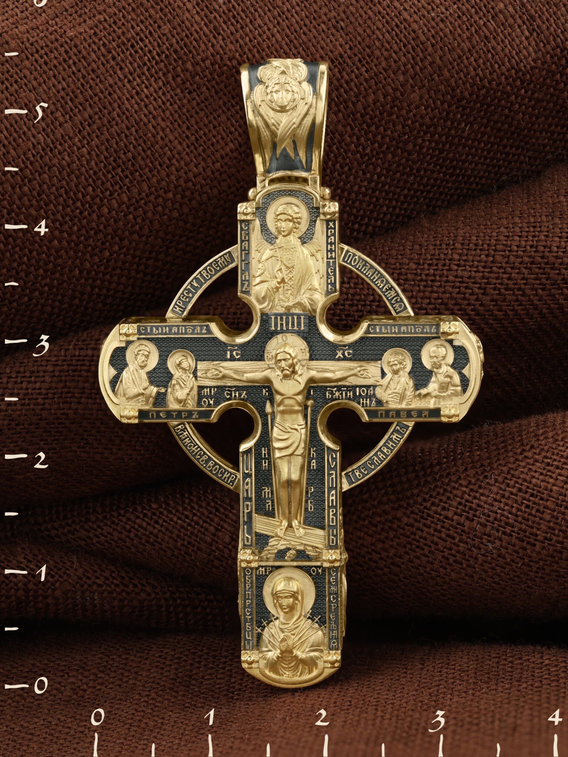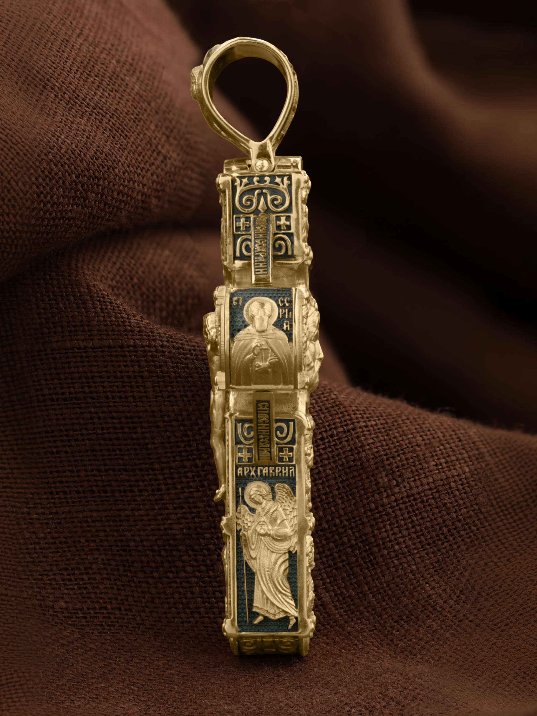 Крест объединяет в одной фигуре два христианских символа — круг-нимб и крест. На лицевой стороне креста изображено Распятие Господа и Спасителя нашего Иисуса Христа. Крест — символ спасения и искупления рода человеческого, знамение победы над смертью и адом. Распятие сопровождается каноническими надписями. На верхней табличке, выше головы Иисуса, расположена надпись, составленная Понтием Пилатом — «IНЦI». Она означает «Иисус Назорей, Царь Иудейский». Надписи «IC» «ХC», что означает Иисус Христос и «Сын Божий» размещается на разных сторонах поперечной перекладины креста. Вдоль Распятия размещены надписи «Царь Славы», «НИКА» (греч. — Победитель) и «МЛРБ» — «место лобное рай бысть» означает место лобное стало раем». Крест стоит на горе камней, символизирующих Голгофу. В ее основании различается череп — это голова Адама. Вдоль креста изображены орудия Страстей Христовых: копие сотника Лонгина, которым пронзили подреберье мёртвого Иисуса, чтобы убедиться в Его смерти, и трость с губкой, с которой Иисуса напоили уксусом. Они обозначены буквами «К» и «Т». Слева от Распятия помещены лики Пречистой Богородицы и Апостола Петра, справа изображены Апостол и евангелист Иоанн Богослов и Апостол Павел. Над Распятием изображен Святой Ангел-Хранитель, ниже — икона Божией Матери «Семистрельная». По кругу размещена молитва: «Кресту Твоему поклоняемся, Владыко, и Святое Воскресение Твое славим». На кулонном кольце помещено изображение Креста «Голгофа», на котором был распят Господь и Спаситель наш Иисус Христос.
