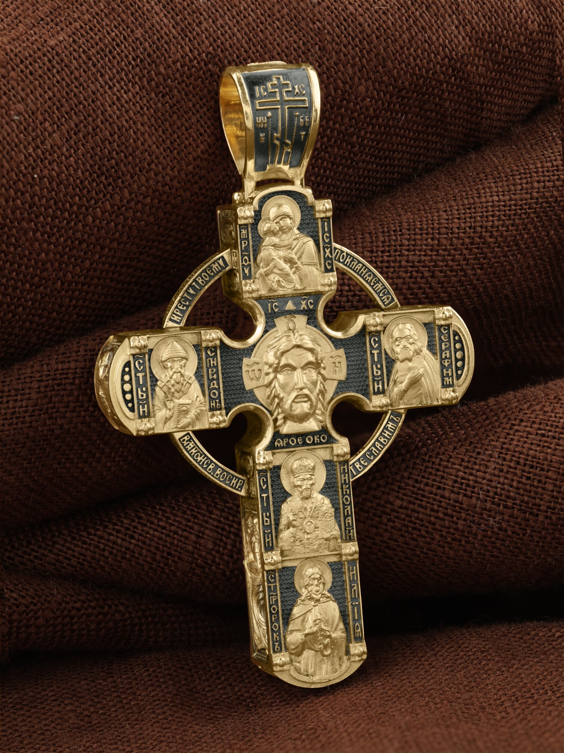 В центре оборотной стороны креста размещен образ Господа и Спасителя нашего Иисуса Христа  — Господь Вседержитель или Пантократор (от греч. всевластный, всесильный). Именование Иисуса «Вседержителем» указывает, с одной стороны, на Его Божественную природу: «Аз есмь Альфа и Омега, начало и конец, говорит Господь, Который есть и был и грядет, Вседержитель» (Откр. 1: 8). С другой стороны, такое именование связано и с человеческой природой Христа, искупившего крестной жертвой людские грехи и обновившего тем самым человеческую природу. Над образом изображена икона Божией Матери «Владимирская», ниже — образы святителя Николая Чудотвореца, архиепископа Мир Ликийских и пророка Ильи. Слева изображен святитель Спиридон Тримифунтский, справа — преподобный Серафим Саровский. На кулонном кольце размещен образ шестикрылого Серафима.