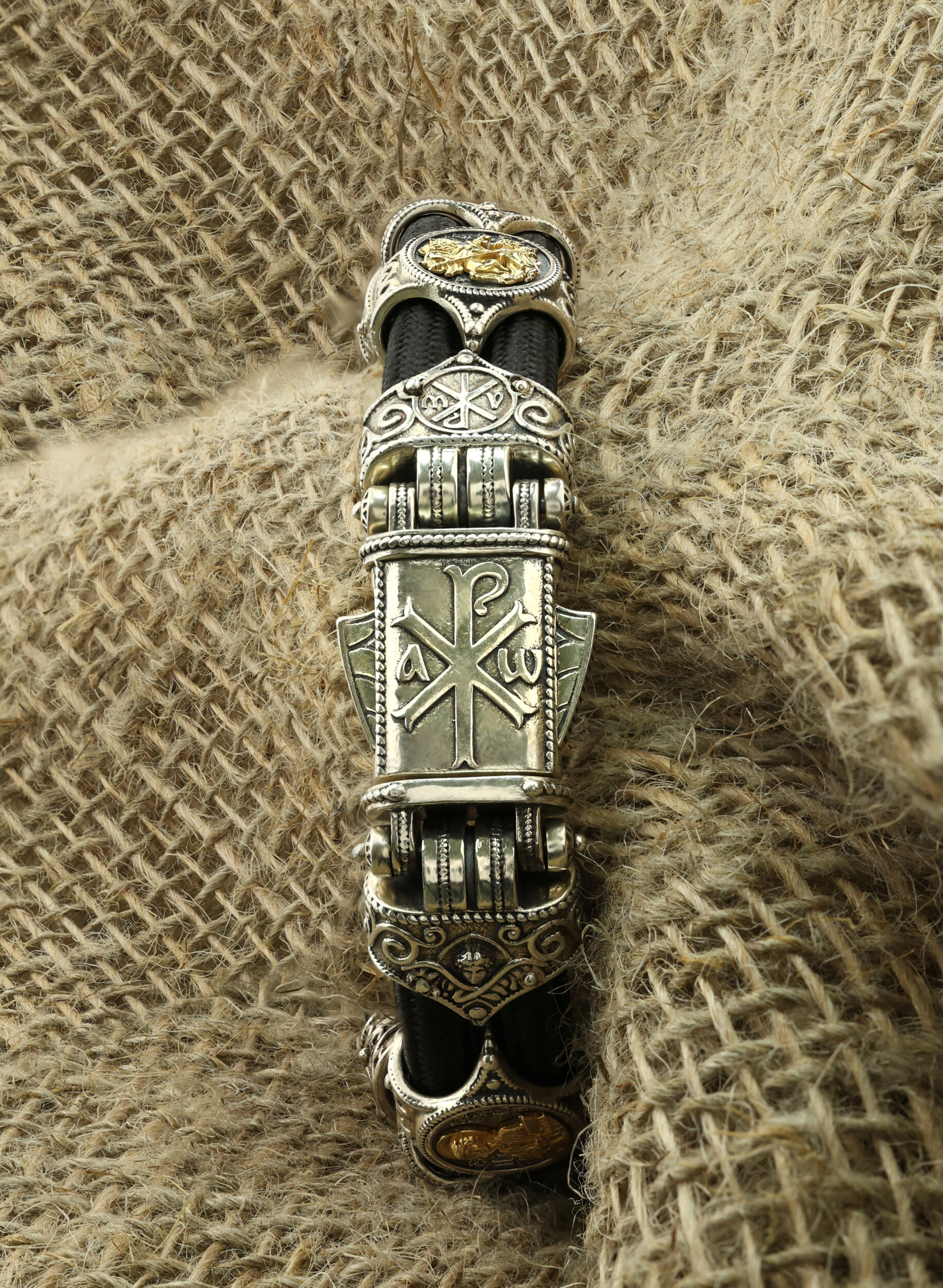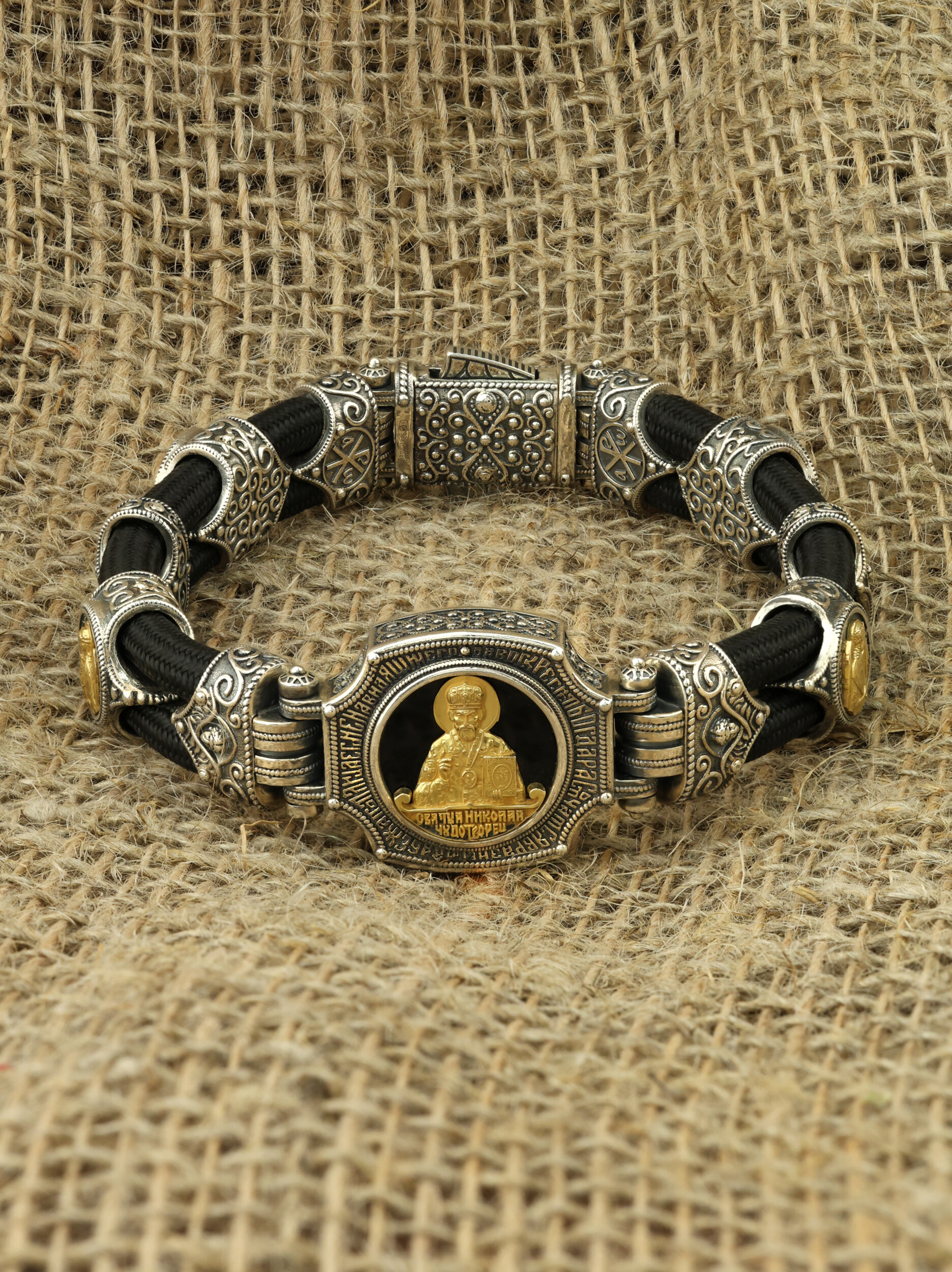 Браслет из серебра и золота c ониксом и шёлковым шнурком
