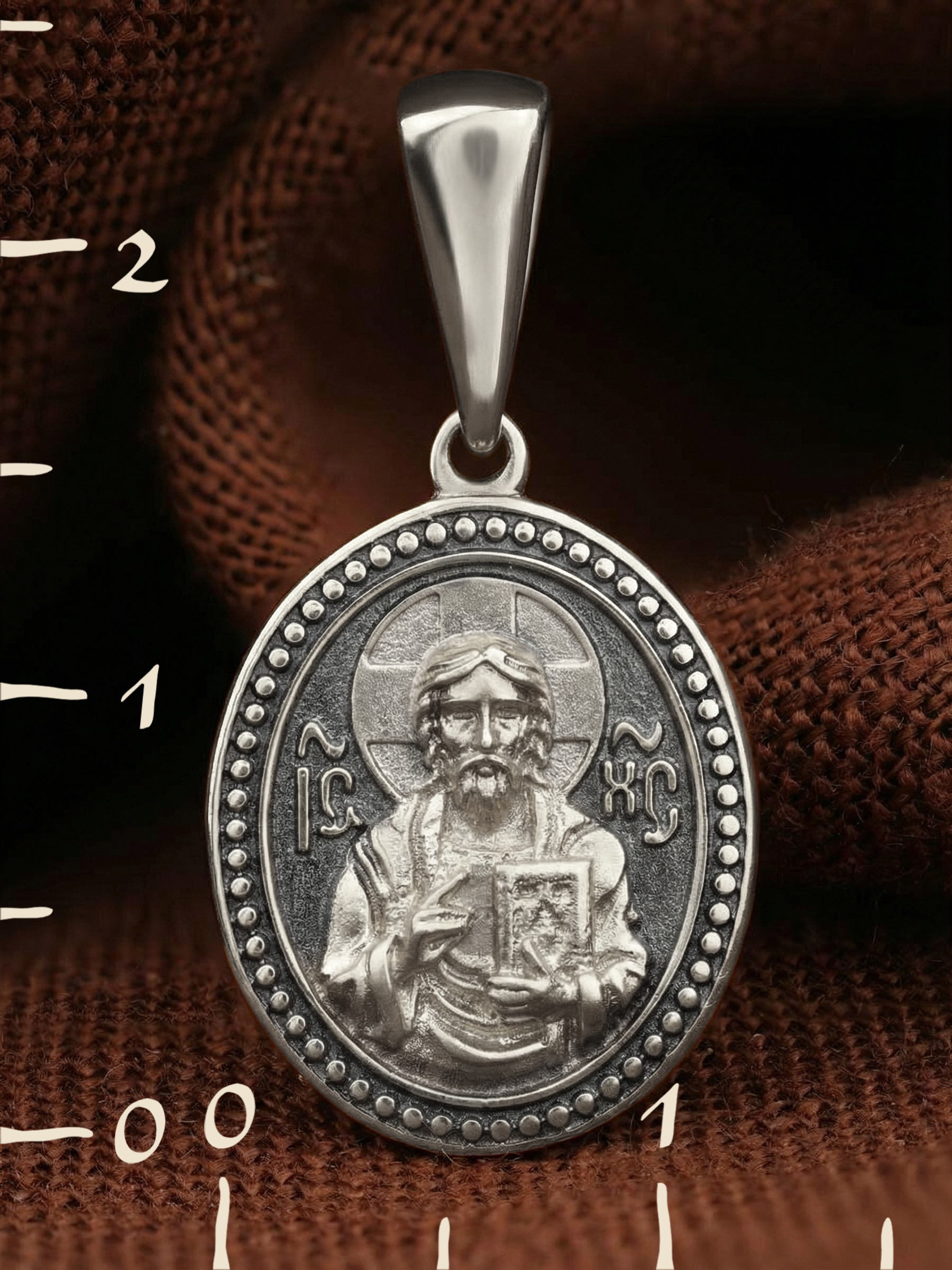 На лицевой части образка изображен Спас Вседержитель или Пантократор (от греч. «панратос» — всевластный, всесильный) — центральный образ в иконографии Христа, представляющий Его как Небесного Царя и Судию. Господь правой рукой благословляет, а в левой держит Книгу Жизни, в которой для каждого человека есть своя страница.
