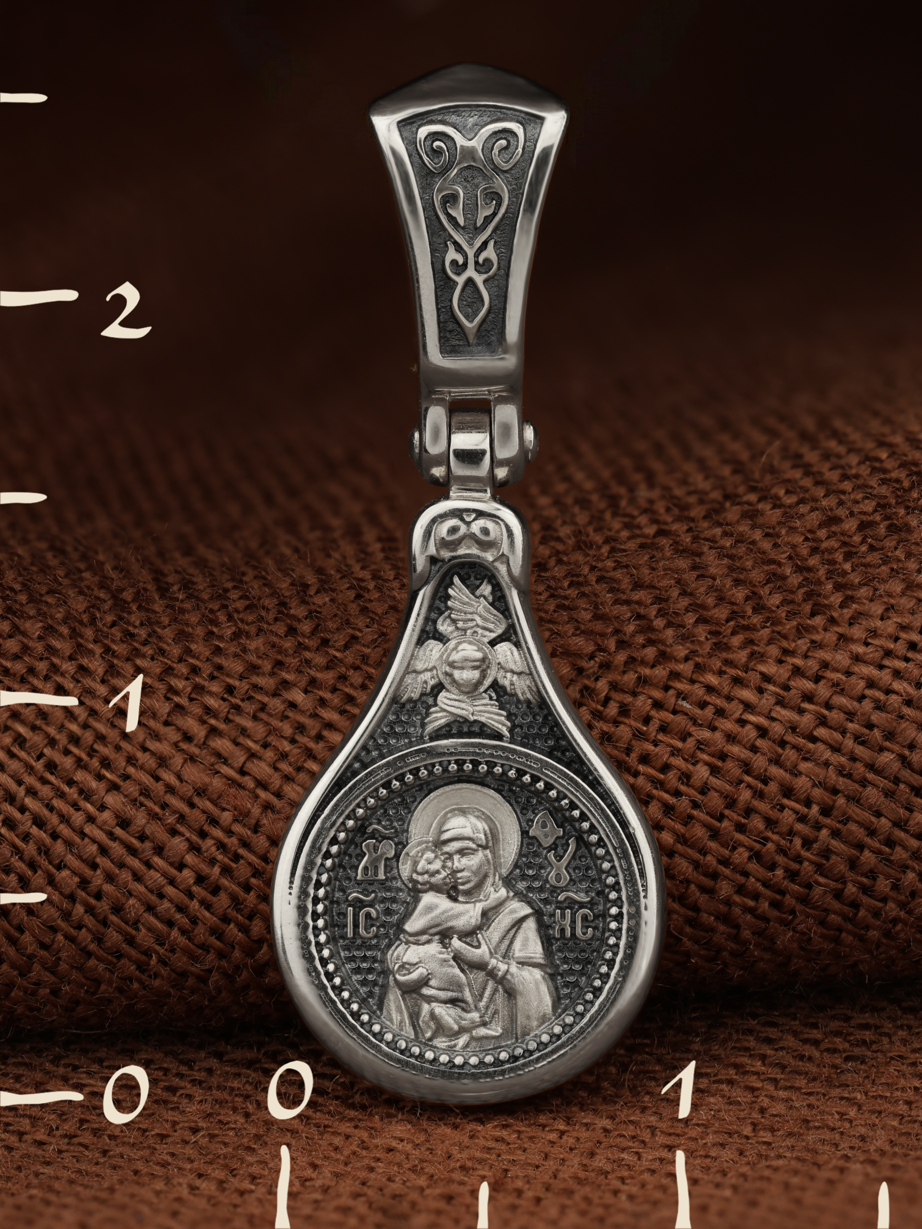 Лицевую сторону образка и кулонное кольцо украшает шестикрылый Серафим — самый приближенный к Господу Ангел.