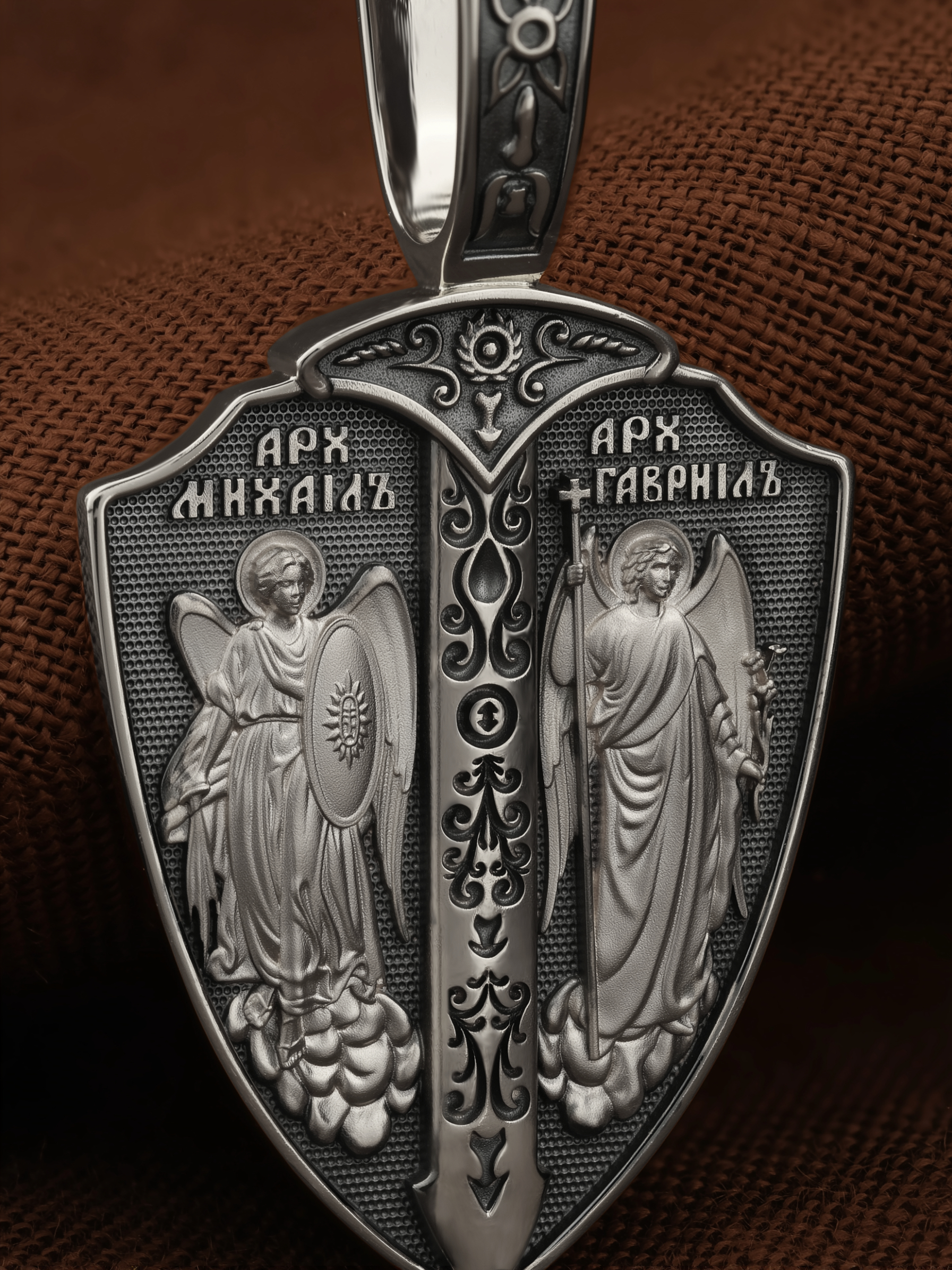 Образок выполнен в виде воинского щита и меча. На лицевой стороне образка изображены Архангел Михаил и Архангел Гавриил. Архангел Михаил изображен в воинственном виде с огненным мечом в правой руке и щитом в левой руке. Архангел Михаил — верный служитель Божий, который низринул с Неба возгордившегося денницу с другими павшими духами. В Православии его называют Архистратигом, что означает глава святого воинства Ангелов и Архангелов. Архангел почитается как покровитель воинов и всех верных Богу и ведущих борьбу против сил зла, борец против ересей, а также защитник душ умерших, страж райских врат. Архангел Гавриил изображен с крестом в правой руке и цветком лилии в левой руке. Он несколько раз упоминается в Писании, как Небесный вестник, которого Бог посылает, чтобы возвестить людям Свои планы о спасении рода человеческого. Так, Архангел Гавриил несколько раз являлся пророку Даниилу и раскрывал ему тайны пришествия Мессии, гонений антихриста и конца мира (Дан. 8, 16, 9−21). Перед пришествием Сына Божия в мир архангел Гавриил явился в храме старцу Захарии и сообщил ему о чудесном зачатии Предтечи. Через шесть месяцев он явился в Назарете Деве Марии с вестью об избрании Ее быть Матерью Христа Спасителя (Лк. 1). Когда Господь перед Своими страданиями молился в Гефсиманском саду до кровавого пота, на укрепление Его, по Церковному Преданию, был послан с Небес Архангел Гавриил. (Лк.22:43). Жены мироносицы услышали от Архистратига радостную весть о Воскресении Христовом.