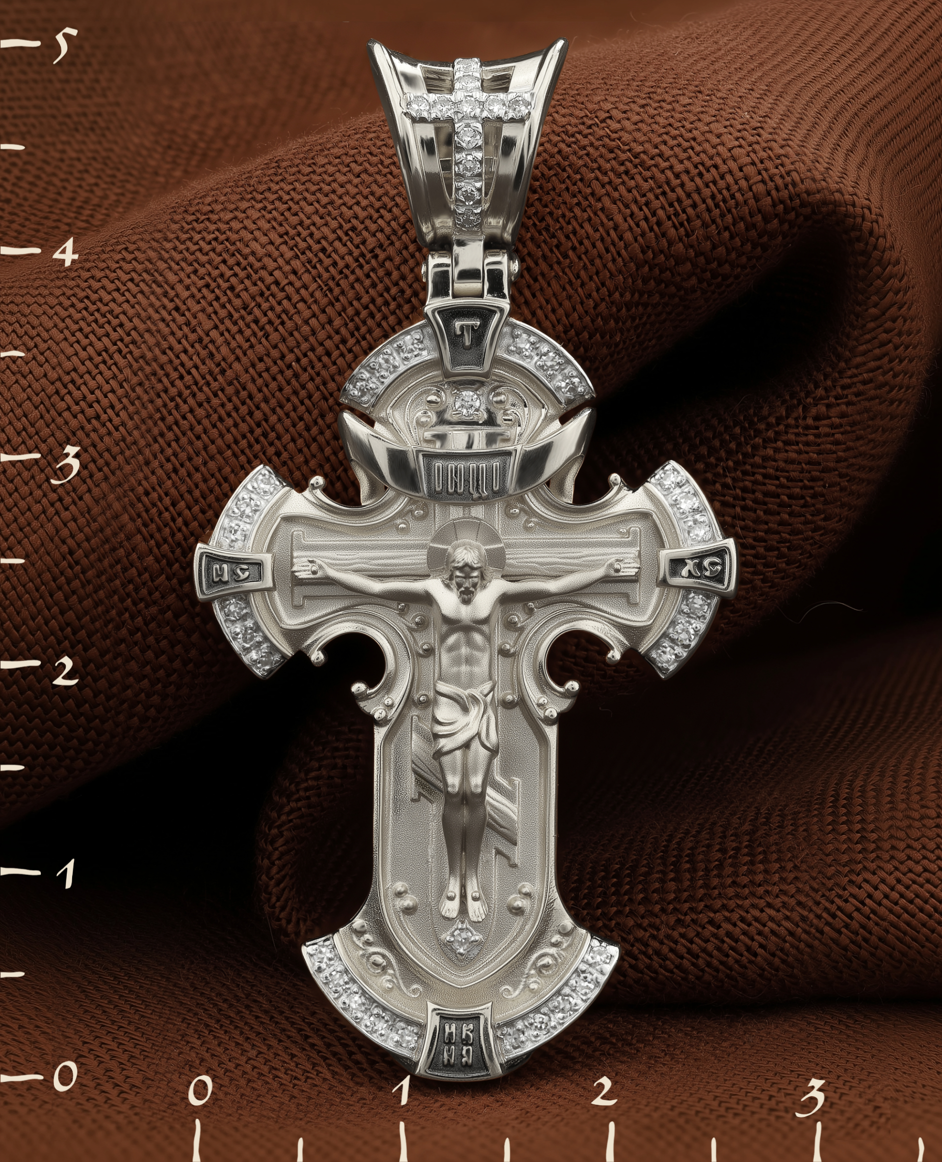 На лицевой стороне креста изображено Распятие Иисуса Христа на Голгофском Кресте, верхняя перекладина которого символизирует титло — табличку, на которой, согласно Евангелию, было начертано: Иисус Назорей Царь Иудейский (IНЦI). Справа и слева от Распятия изображены символы «IС ХС» — святое имя Христа. Внизу креста написано слово «НИКА», что значит «победитель». В верхней части креста обозначена буква «Т», которая символизирует одно из орудий страданий Господа — трость.