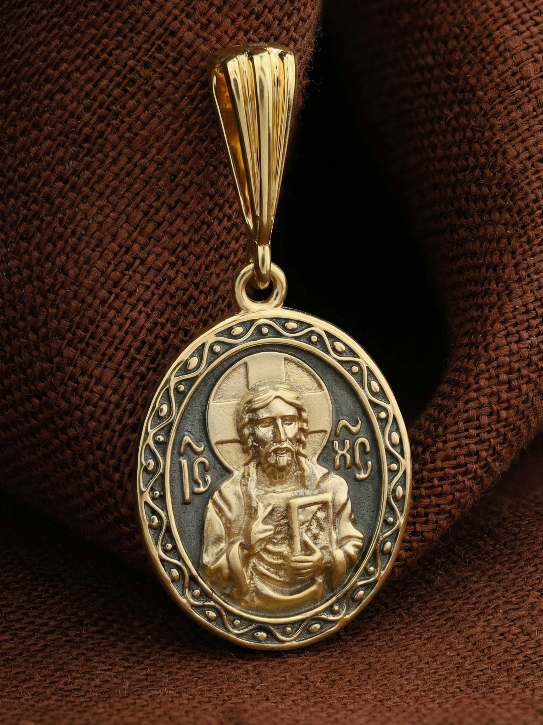 На лицевой части образка изображен Спас Вседержитель или Пантократор (от греч. «панкратос"— всевластный, всесильный) — центральный образ в иконографии Христа, представляющий Его как Небесного Царя и Судию. Господь правой рукой благословляет, а в левой держит Книгу Жизни, в которой для каждого человека есть своя страница.