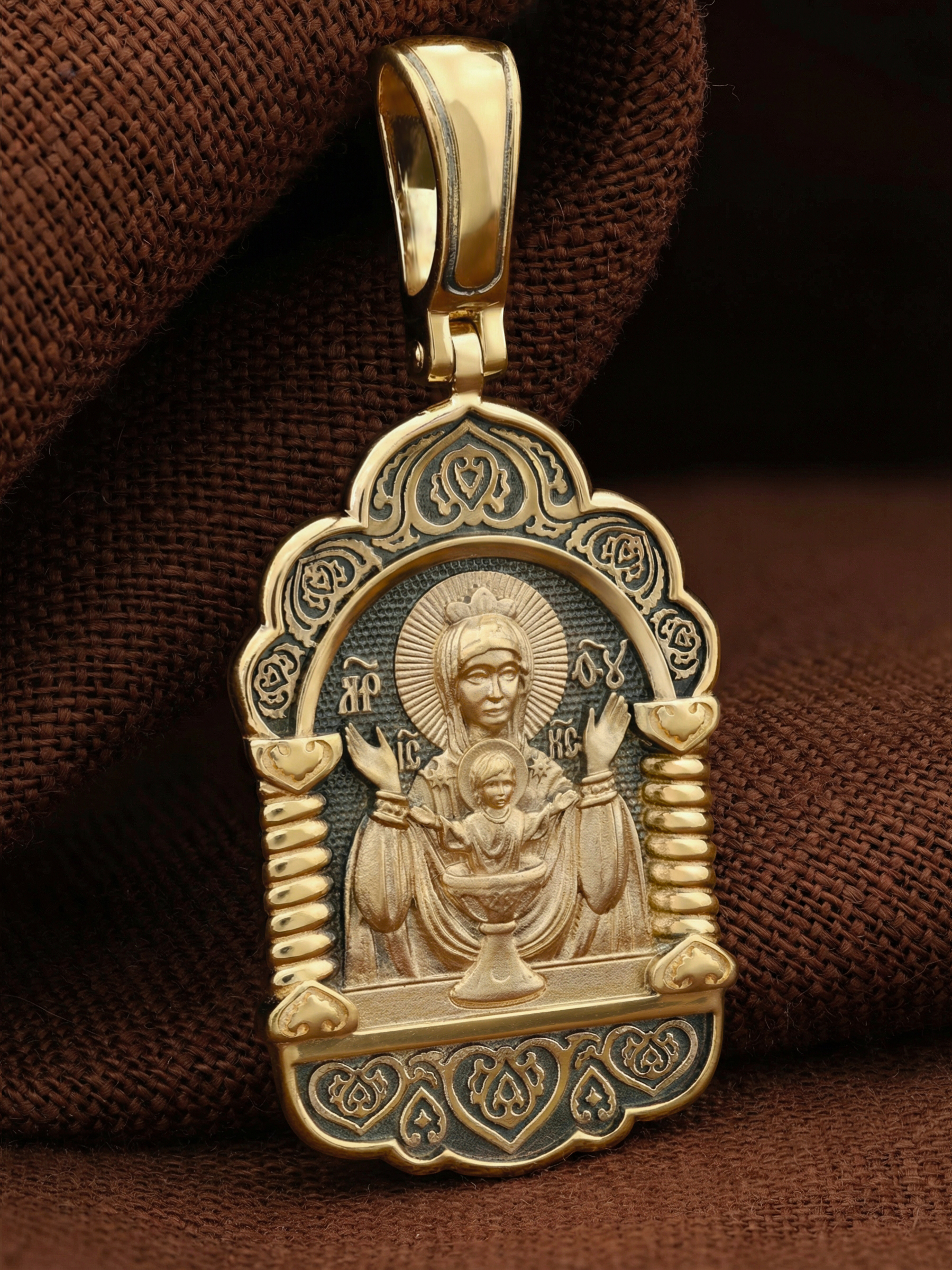 На лицевой части образка изображена икона Божией Матери «Неупиваемая чаша». Икона славится помощью в исцелении зависимостей, помогает людям обрести свободу от греховных страстей.