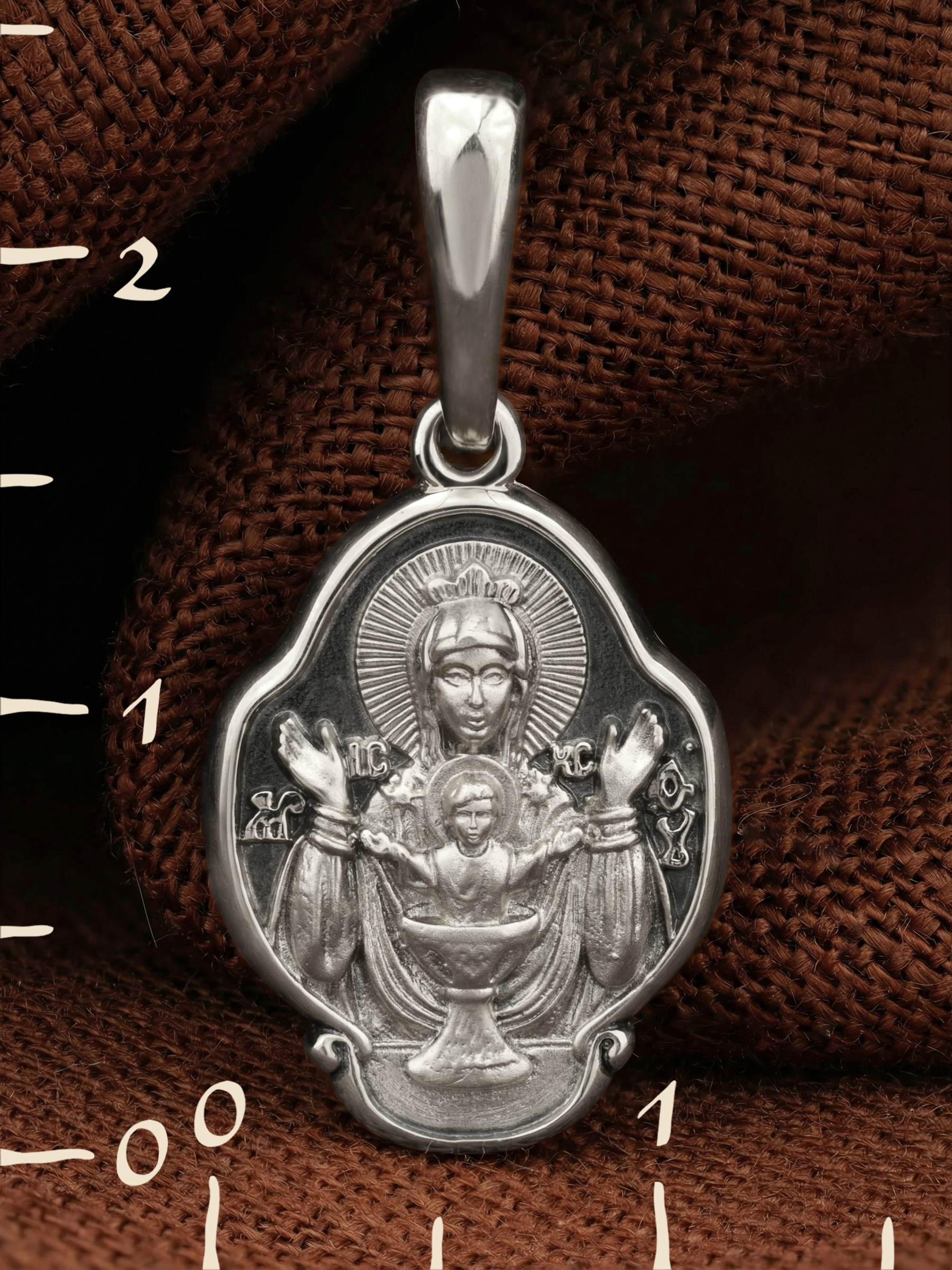 На лицевой части образка изображена икона Божией Матери «Неупиваемая чаша». Икона славится помощью в исцелении зависимостей, помогает людям обрести свободу от греховных страстей.