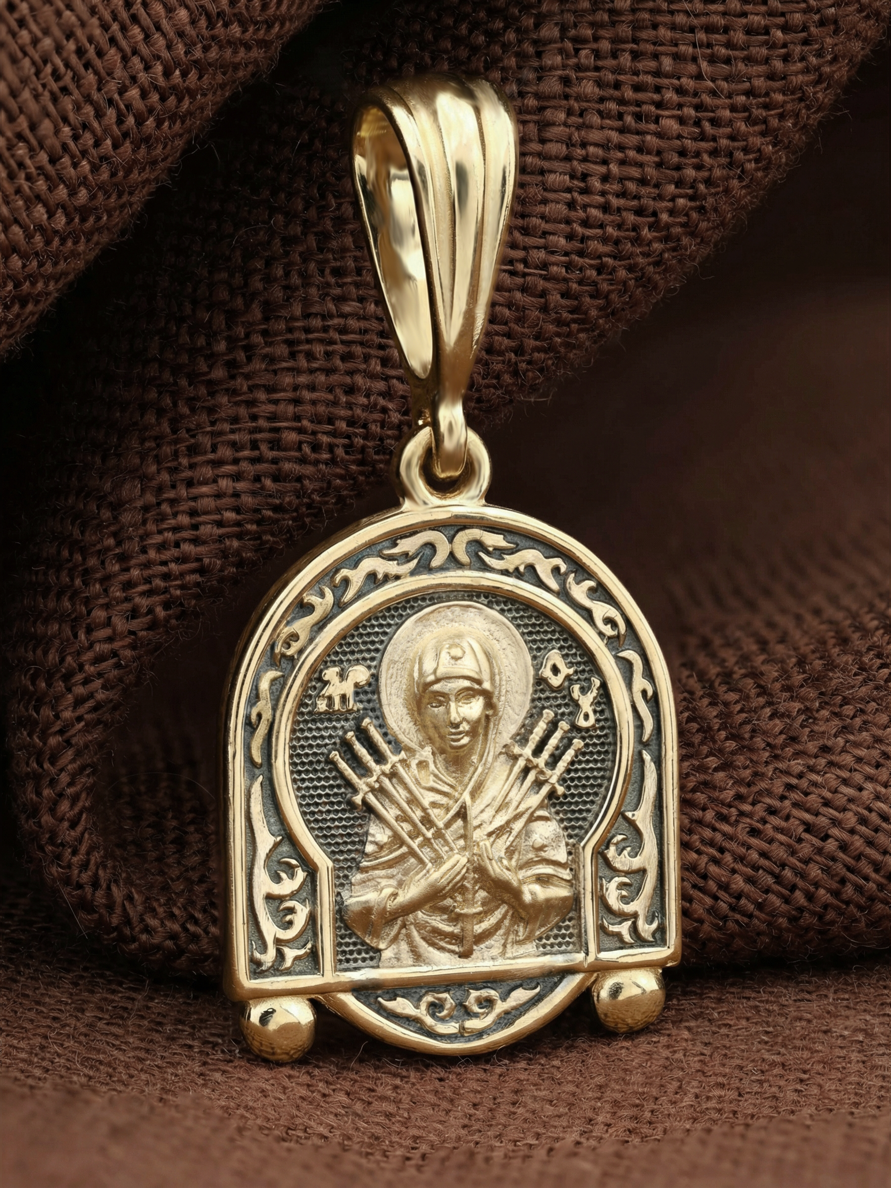 Пресвятая Богородица символически изображена пронзенной семью стрелами. Это образ скорби Матери, увидевшей страдания Своего Сына. Подобно тому, как Тело Христа пронзили гвоздями и копием, так и душу Пречистой Его Матери поразило «оружие» печали и сердечной боли. По учению Православной Церкви Господь был распят за грехи людей, и каждый день вновь распинается на Литургии за новые грехи ныне живущих. Поэтому семь стрел символически означают также семь смертных грехов человеческих, приносящих Богородице новые скорби.