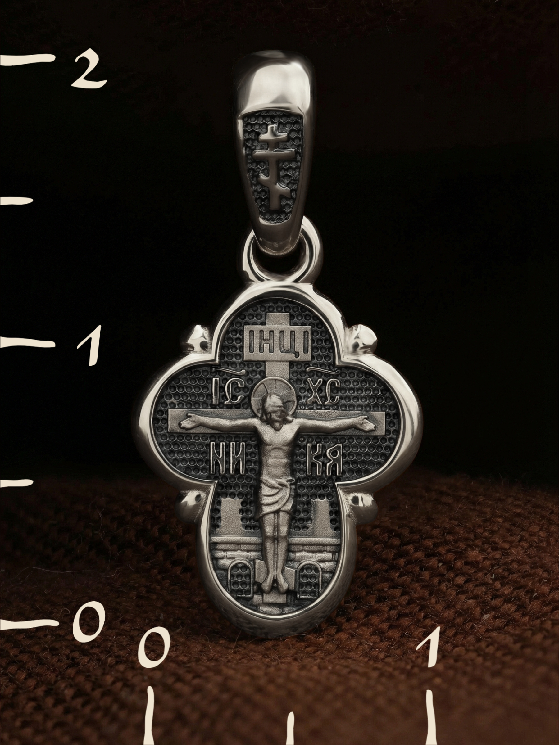На лицевой стороне креста изображено Распятие Господа и Спасителя нашего Иисуса Христа, отдавшего Себя на смерть, для искупления грехов мира. Крест является символом жертвенной любви Всеблагого Бога к падшим людям, всепобеждающим духовным оружием христиан, основанием и средоточием церковной жизни. Господь сказал: «кто хочет идти за Мною, отвергнись себя, и возьми крест свой, и следуй за Мною». (Мк. 8: 34). На верхней табличке, выше головы Иисуса, расположена надпись, составленная Понтием Пилатом — «IНЦI». Она означает «Иисус Назорей, Царь Иудейский». Надпись «IC» «ХC», означает Иисус Христос, помещается на разных сторонах поперечной перекладины креста. Рядом — слово «НИКА», что означает «победитель». За крестом высится Иерусалимская стена. Над вершиной Распятия, на кулонном кольце, помещен крест.