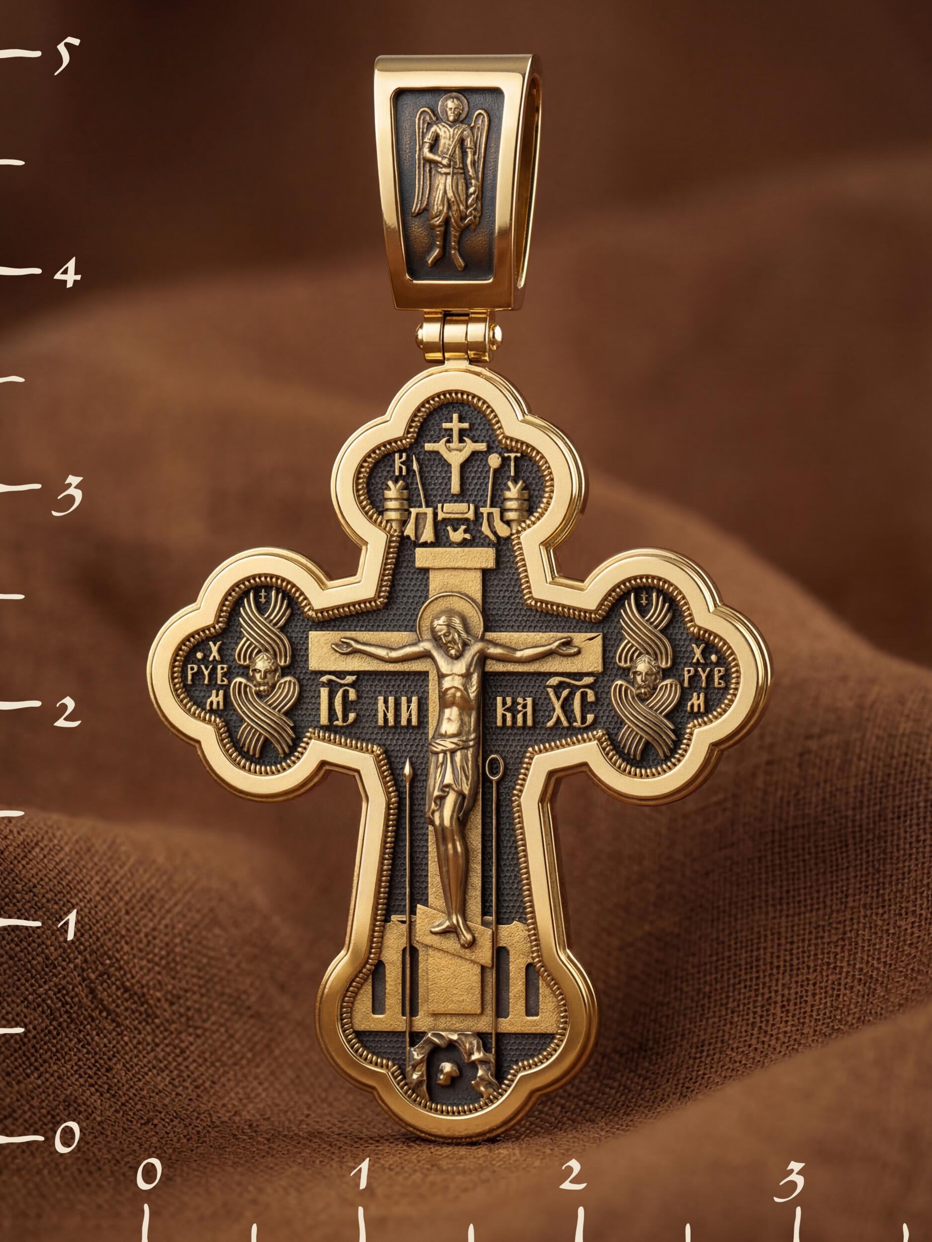 Основой композиции лицевой стороны креста является Распятие Иисуса Христа. Справа и слева от Распятия изображены Ангелы, первыми стоящие у Престола Господа — Херувимы. Под основной перекладиной рядом с титлами Святого имени Христа написано «НИКА», что значит «победитель». Сверху над Распятием помещен Голгофский Крест с цатой, рядом с которым, орудия страданий Господа — трость и копие, обозначенные буквами «Т» и «К».