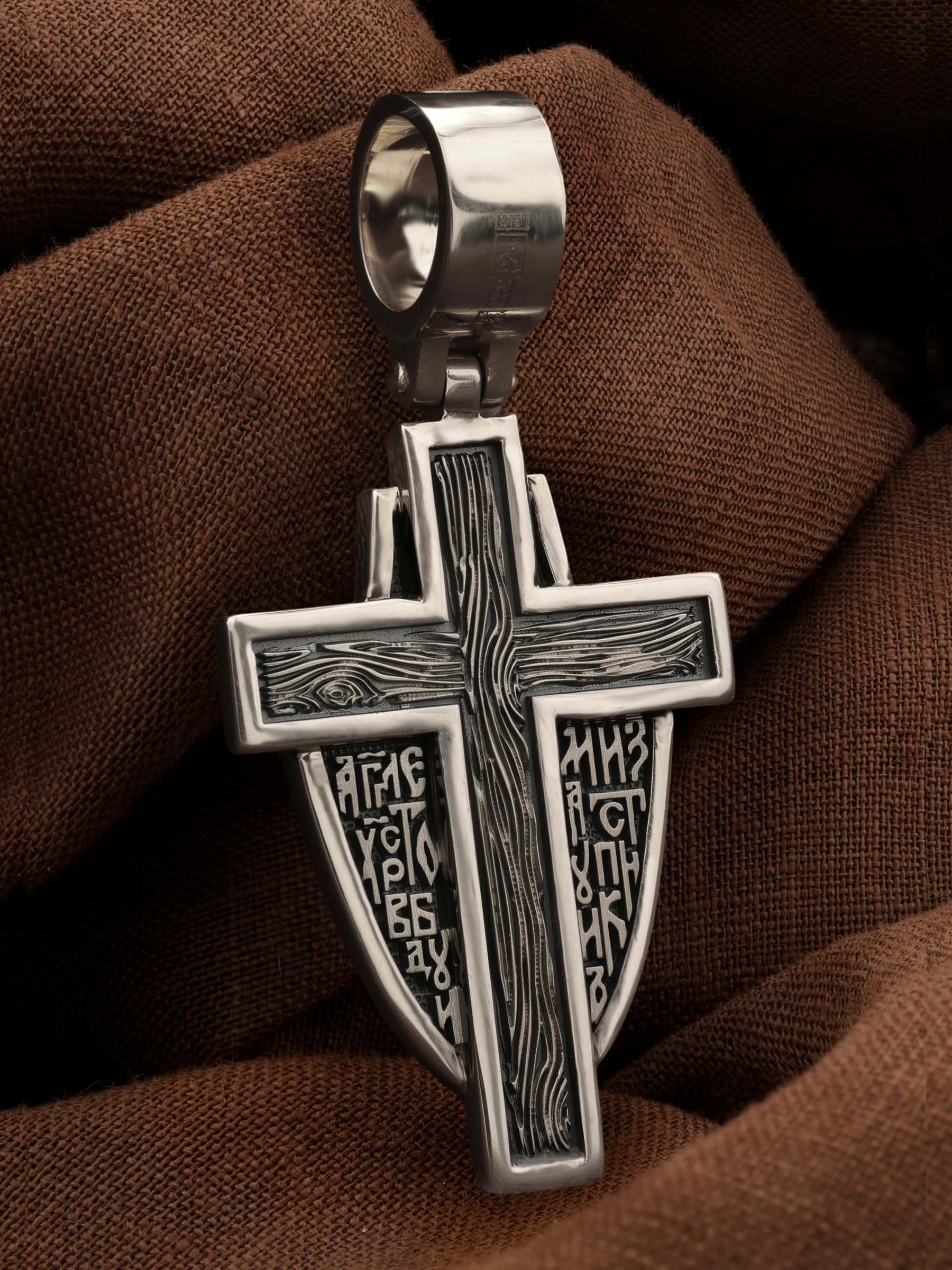 Основой композиции является изображение Святого Ангела-Хранителя держащего в правой руке крест, а в левой — мечь. Он изображен на фоне воинского щита. Крест является символом жертвенной любви всеблагого Бога к падшим людям, всепобеждающим духовным оружием христиан, основанием и средоточием церковной жизни. Господь сказал: «кто хочет идти за Мною, отвергнись себя, и возьми крест свой, и следуй за Мною». (Мк. 8: 34). Ангел-Хранитель — это Ангел приставляемый Богом к человеку при крещении для охраны и помощи в добрых делах. Он невидимо находится при человеке на протяжении всей его жизни, если человек сохраняет в себе любовь к Богу и истинную веру перед Ним. Ангел-Xранитель делают для нас все, что служит к истинному нашему благу и спасению. Невидимо пребывая при нас постоянно, он, руководствуя нас ко спасению, не только по нашему желанию таинственно наставляет нас на все доброе и полезное, не только возносит наши молитвы к Богу, но еще и сам от себя охраняют и защищают нас от врагов видимых и невидимых и ходатайствует за нас пред Богом. Ангел-Хранитель так любит нас, как никто на земле любить не может. Одного лишь каждому из нас он желает — спасения души; к этому он направляет все свои заботы. И если видит нас также заботящимися о спасении, радуется, если же видит нас пребывающими в нерадении о душе своей, скорбит. Но и самый великий грешник может примириться со своим Ангелом-Хранителем посредством искреннего раскаяния в грехах и оставления их навсегда. В таком случае, по слову Писания, великая радость бывает для всех ангелов на небесах (Лк. 15:10).
