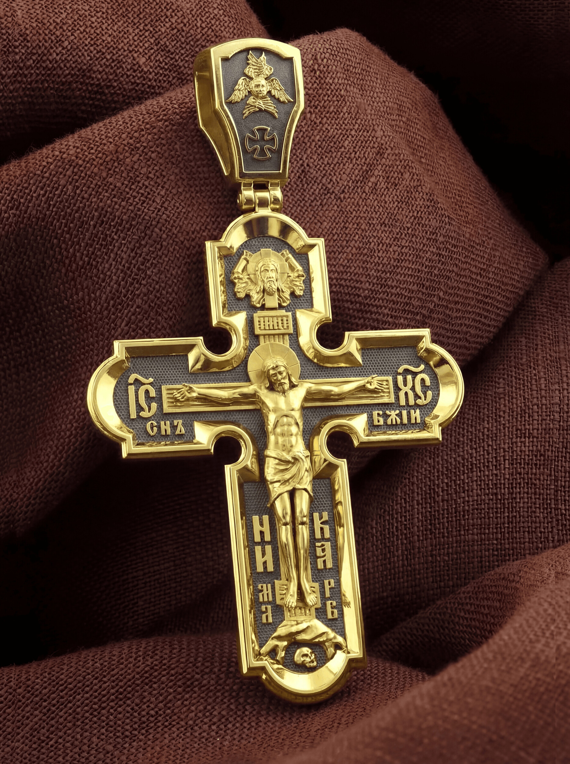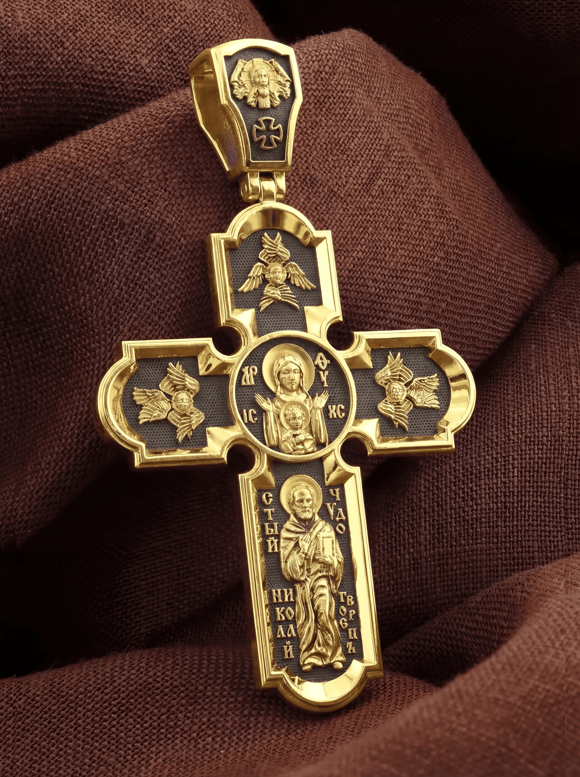 На лицевой стороне нательного креста по традиции изображено Распятие Господа нашего Иисуса Христа. Крест Господень стоит на небольшом каменистом возвышении, символизирующем гору Голгофу, которая обозначена буквами МЛРБ (Место Лобное Рай Бысть). Над головой Господа на поперечной перекладине написано «ИНЦИ», что символизирует табличку, которая была прибита к Кресту, с надписью «Иисус Назорей Царь Иудейский». Этим иудеи хотели посмеяться над Христом, не зная, что распинают истинного Царя всех царей. По сторонам основной перекладины расположены позолоченные рельефные инициалы Христа «ИС ХС». Под перекладиной, по сторонам древа, находится надпись «СЫН БОЖИЙ», а в основании креста — надпись «НИКА» (Победитель).