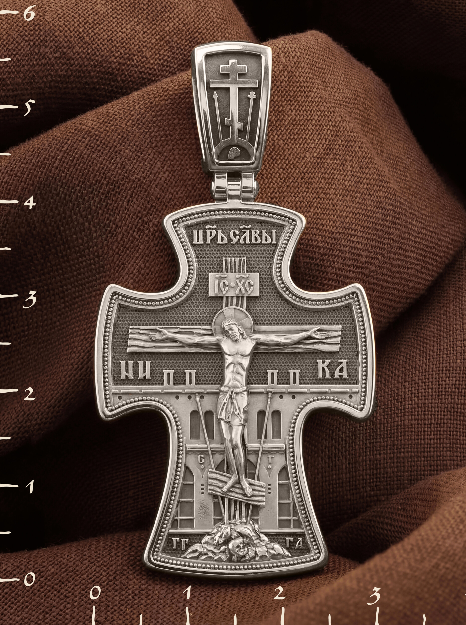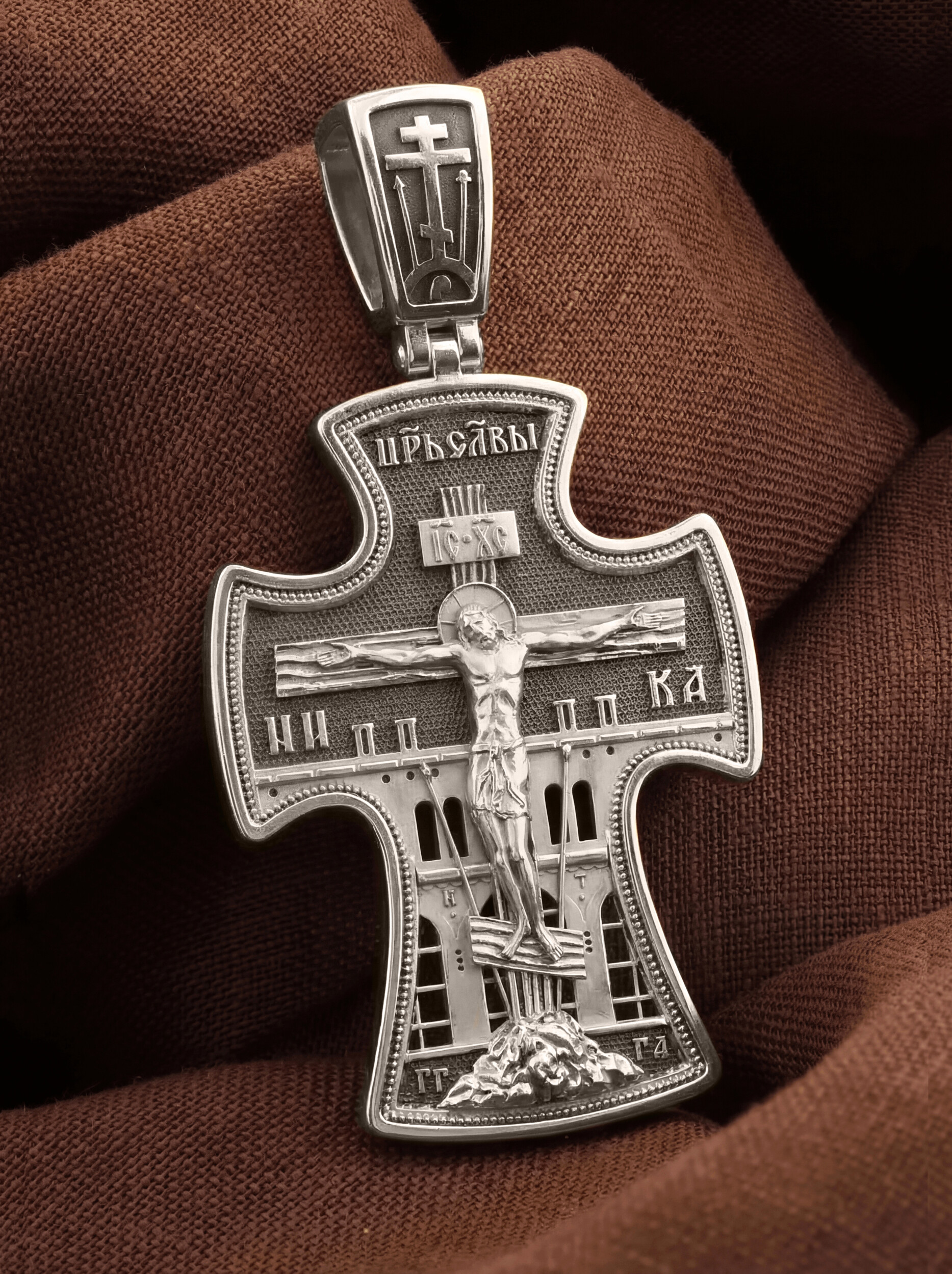 Основное поле лицевой стороны креста занято рельефным изображением Распятия Христова на восьмиконечном Голгофском Кресте. Позади Распятия видна иерусалимская стена, знак того, что Господь был распят вне стен города. Но вместе с тем стена символизирует и Небесный Иерусалим, путь который открылся для человека через Голгофу. У подножья Господа в виде скалистой горки видна сама Голгофа с Главой Адамовой в пещере. По сторонам Голгофы начертаны буквы «ГГ» (Гора Голгофа) и «ГА» (голова Адама). Справа и слева от Креста изображены орудия страданий Господа — трость и копие, обозначенные буквами «Т» и «К». На трости стражники подали Христу пропитанную уксусом губку, когда Он жаждал воды, а копьем пронзили Ему ребра, чтобы проверить: умер ли Он?
